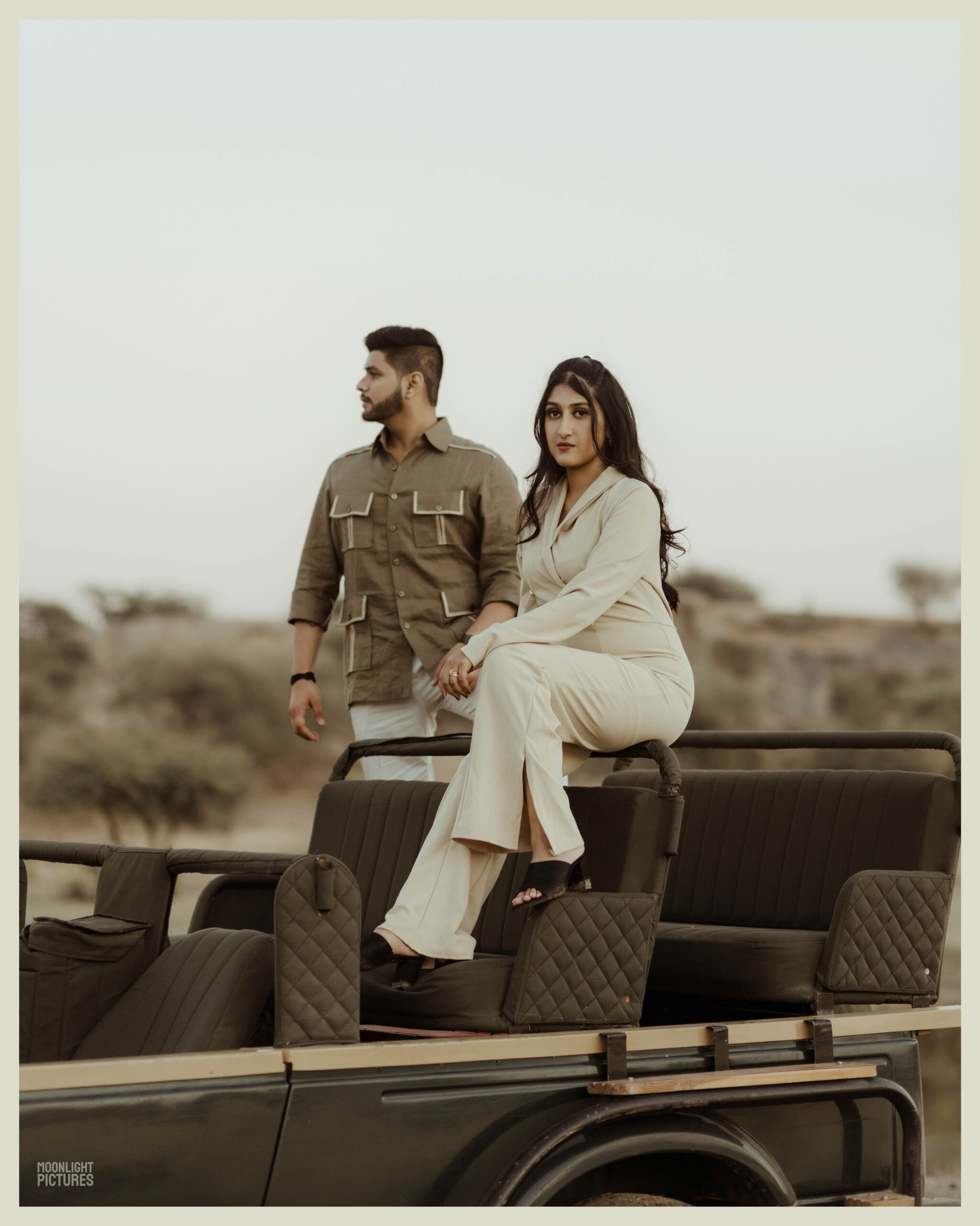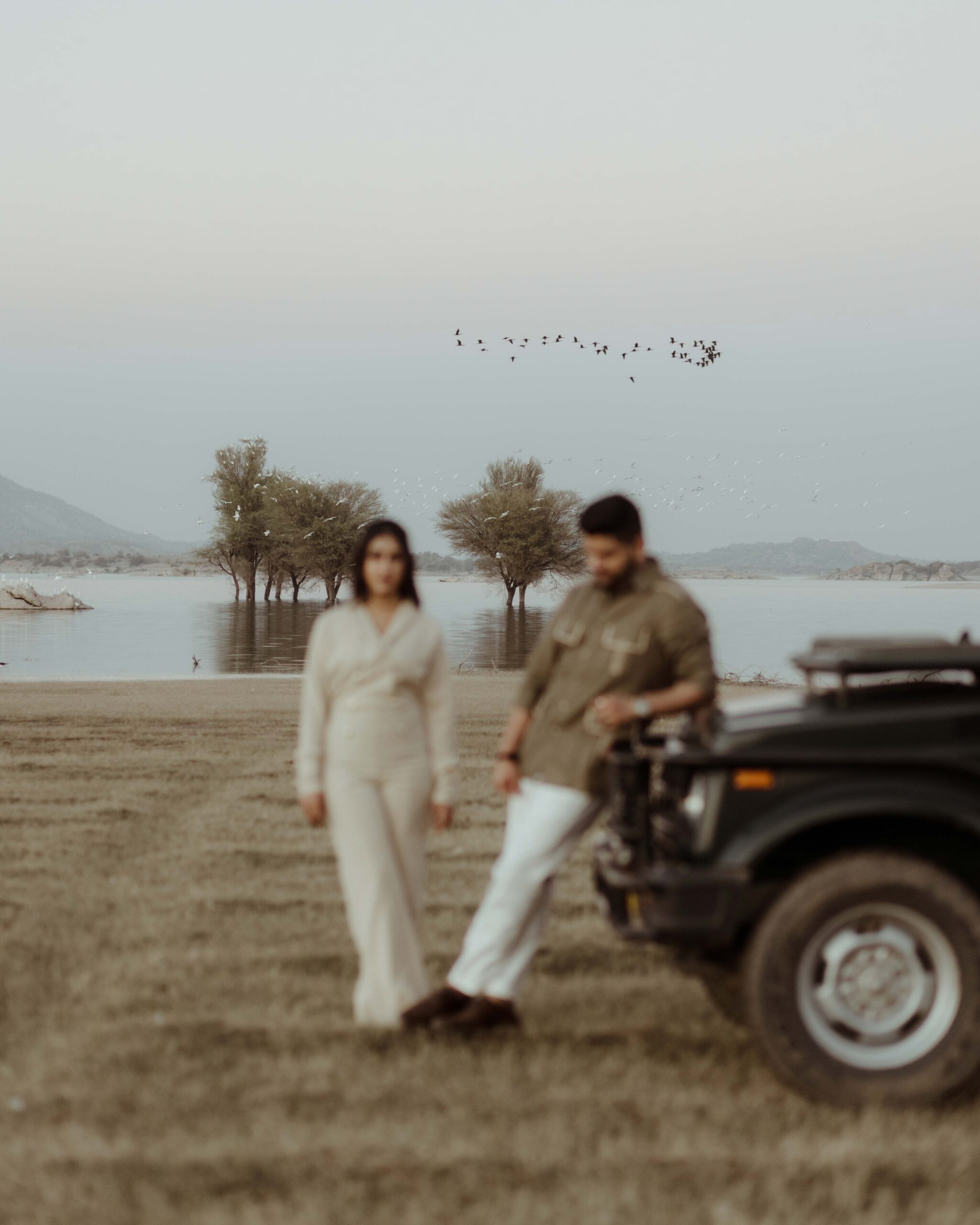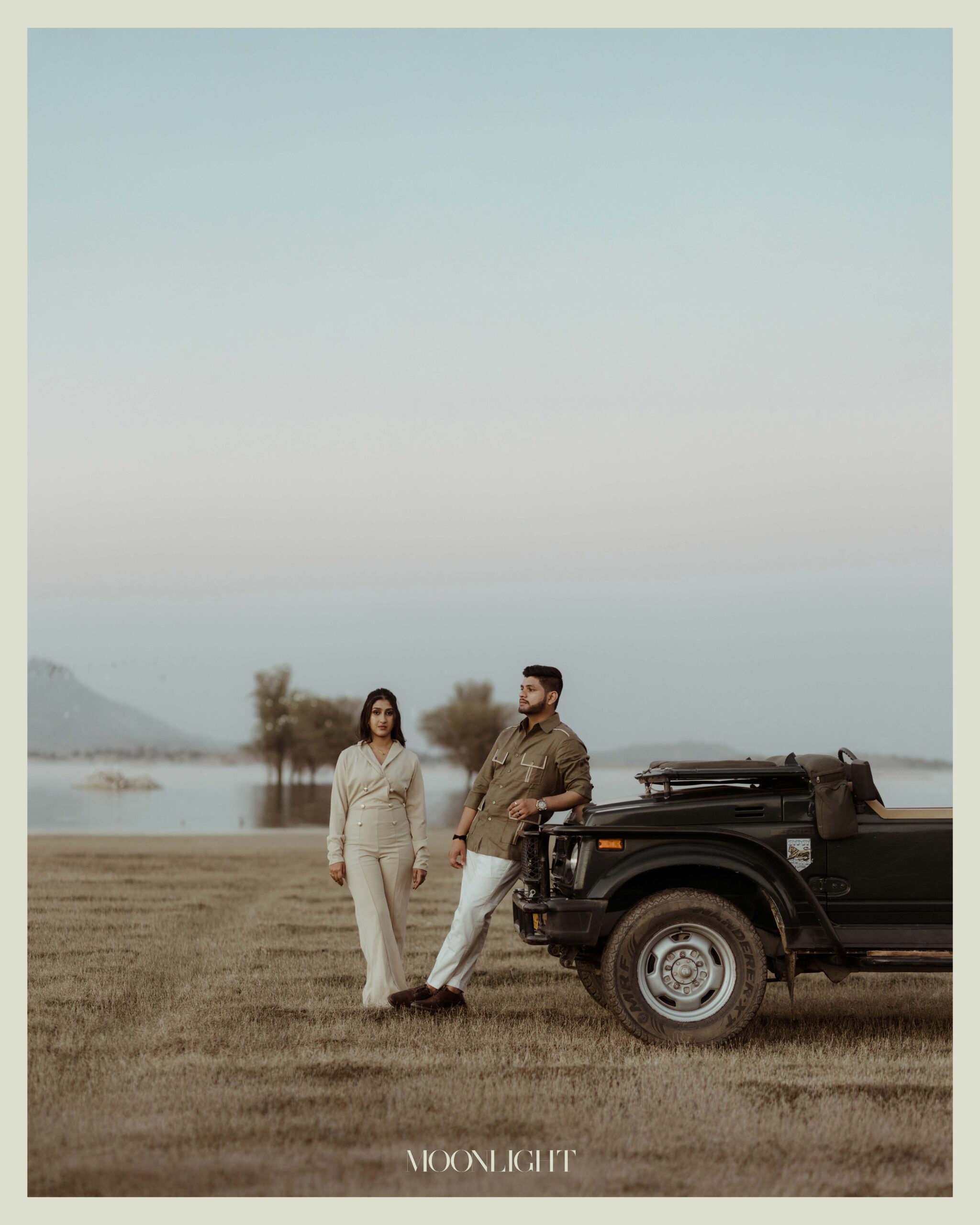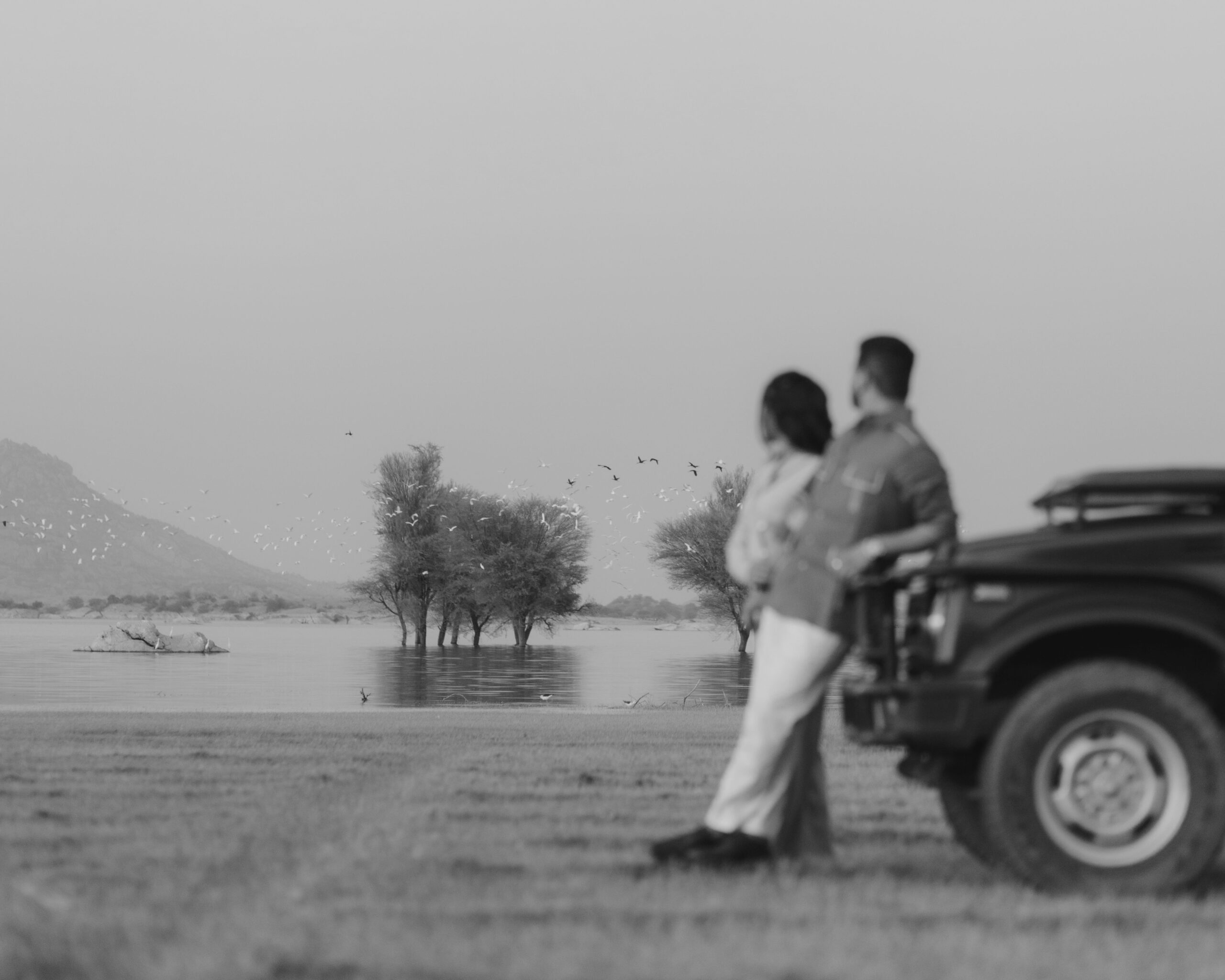 In the heart of Jawai, where the skies stretch vast and the silence speaks in rustling leaves and distant bird calls, Kalrav and Urmi found a rhythm that was deeply their own. Their story unfolded not in choreographed poses, but in quiet moments; a glance over a shoulder, a shared sip of coffee by the lake, wind-tousled hair catching the last light of the day. The pastel tones of their journey, soft cream and gentle teal, felt like an echo of who they are together: calm, grounded, yet touched with wild golden freedom. It was never about the perfect frame. It was about the feeling. The way she stood tall on the back of the gypsy as he drove, completely herself. The way he let her be, with pride in his eyes and ease in his heart. They moved through the rugged wilderness not as tourists in love, but as two souls who understood that true love does not cage, it sets free.