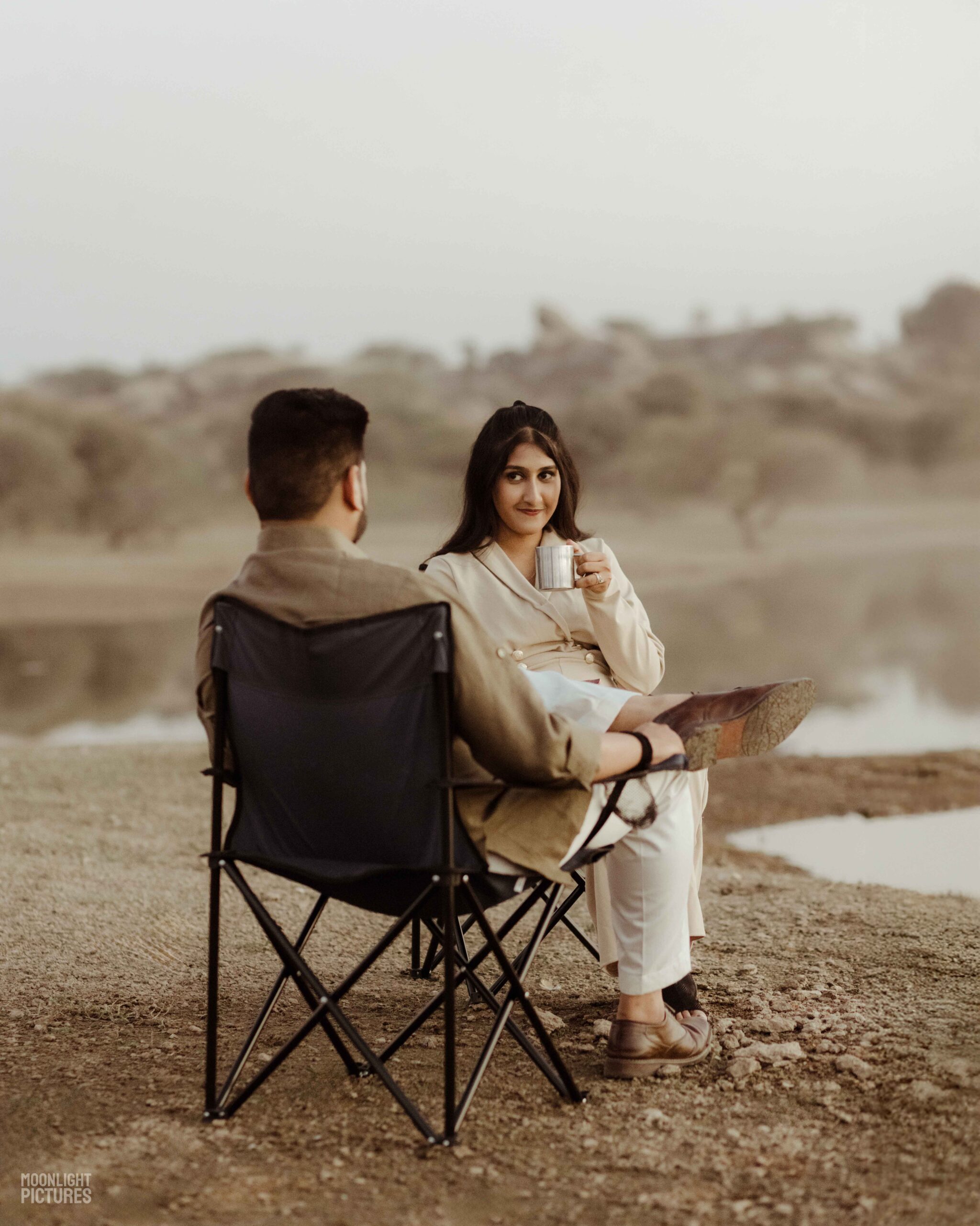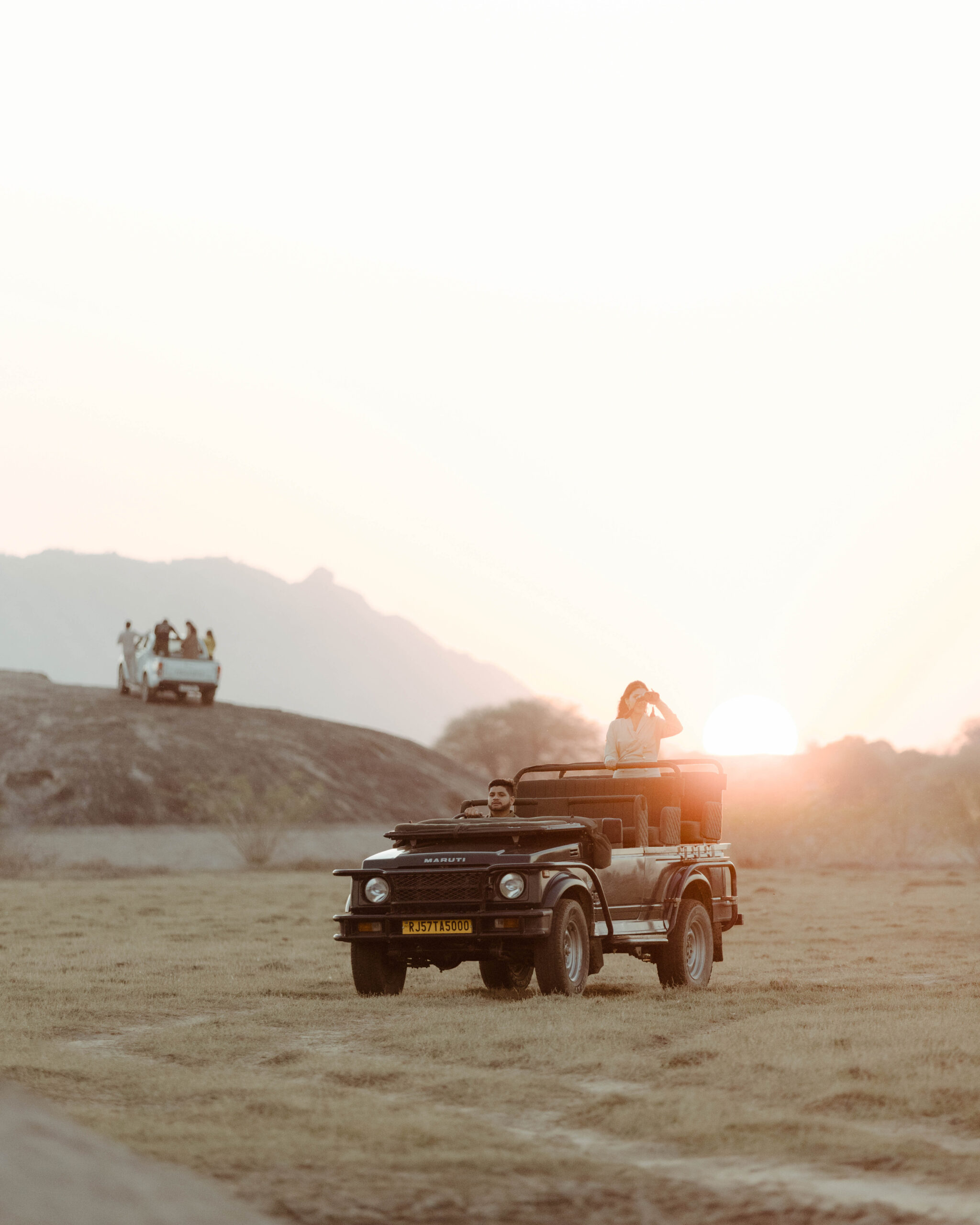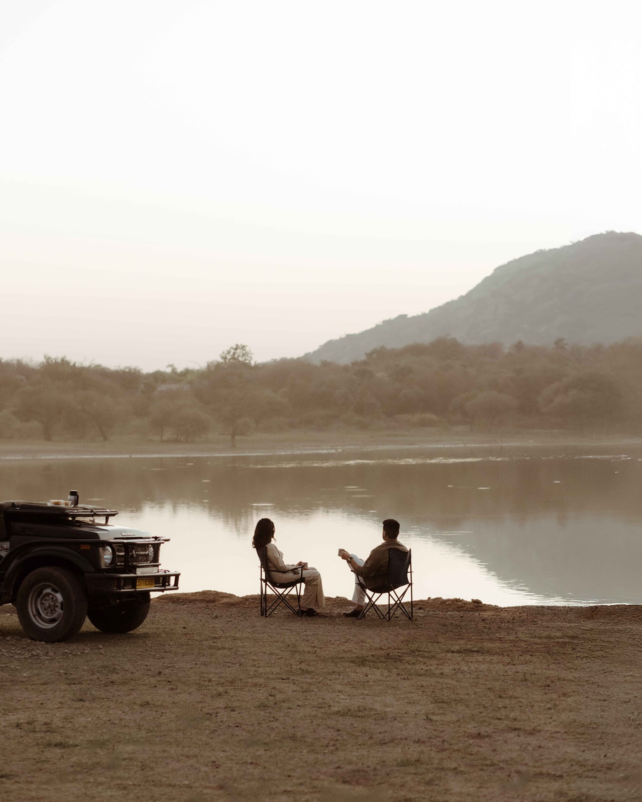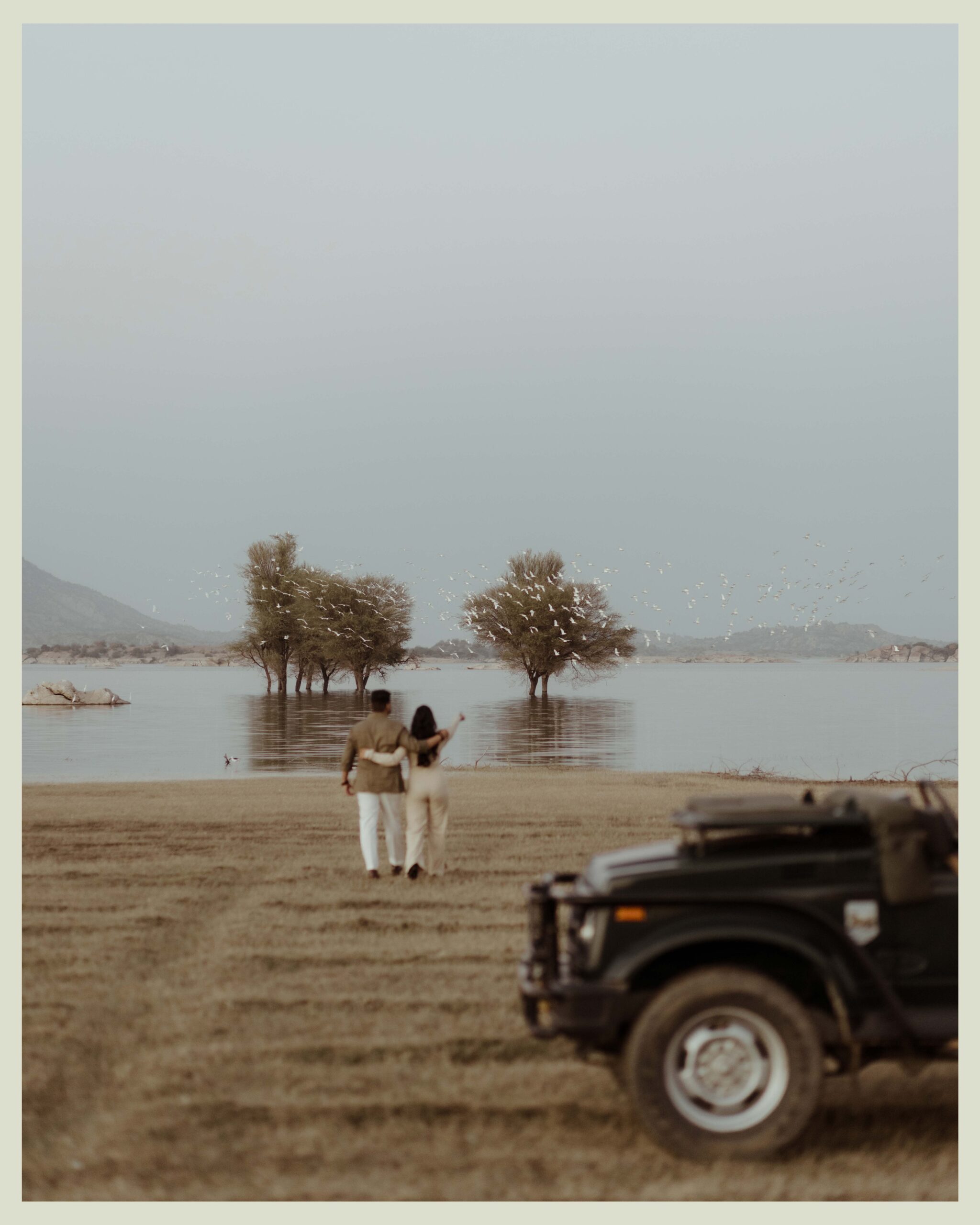 In the heart of Jawai, where the skies stretch vast and the silence speaks in rustling leaves and distant bird calls, Kalrav and Urmi found a rhythm that was deeply their own. Their story unfolded not in choreographed poses, but in quiet moments; a glance over a shoulder, a shared sip of coffee by the lake, wind-tousled hair catching the last light of the day. The pastel tones of their journey, soft cream and gentle teal, felt like an echo of who they are together: calm, grounded, yet touched with wild golden freedom. It was never about the perfect frame. It was about the feeling. The way she stood tall on the back of the gypsy as he drove, completely herself. The way he let her be, with pride in his eyes and ease in his heart. They moved through the rugged wilderness not as tourists in love, but as two souls who understood that true love does not cage, it sets free.