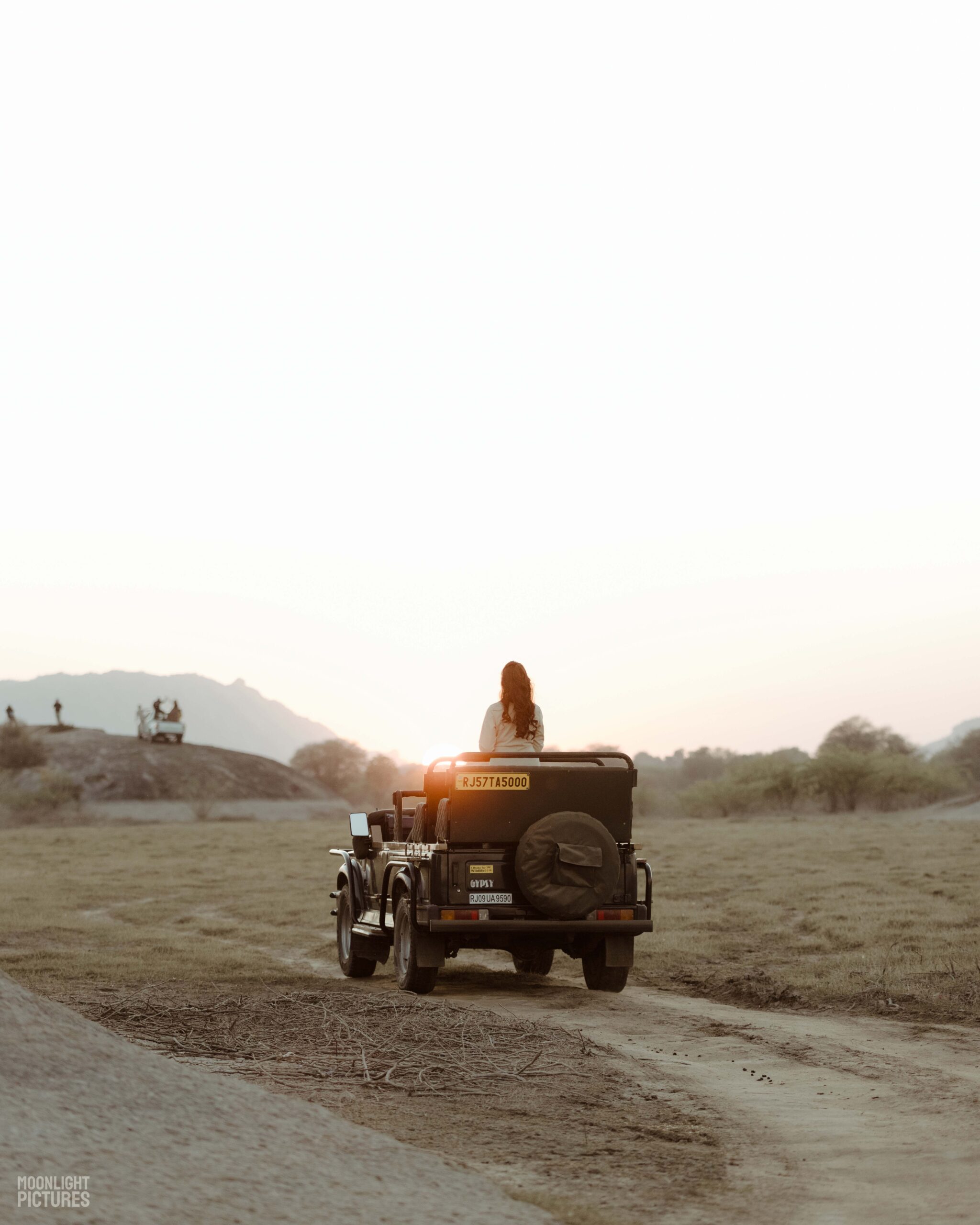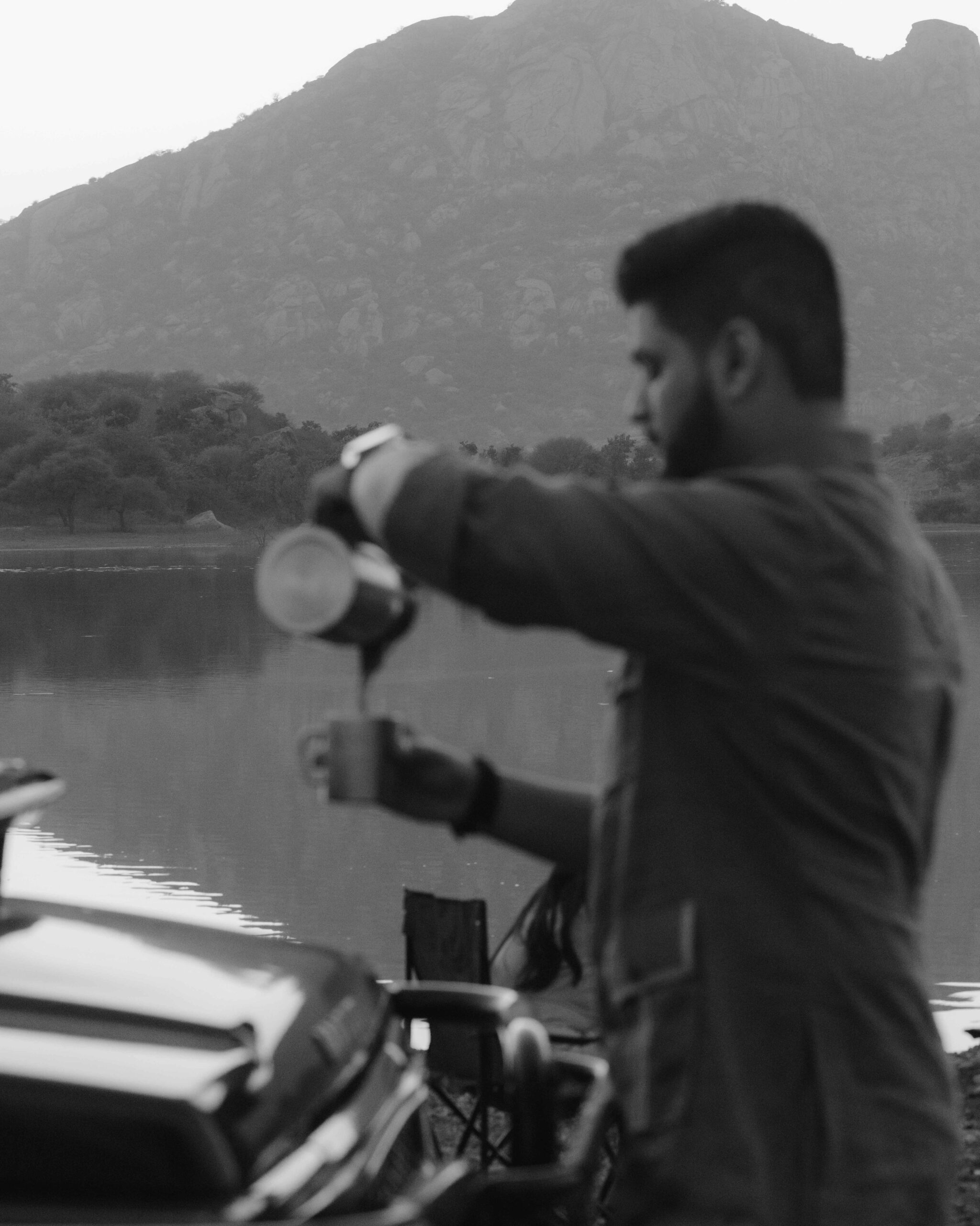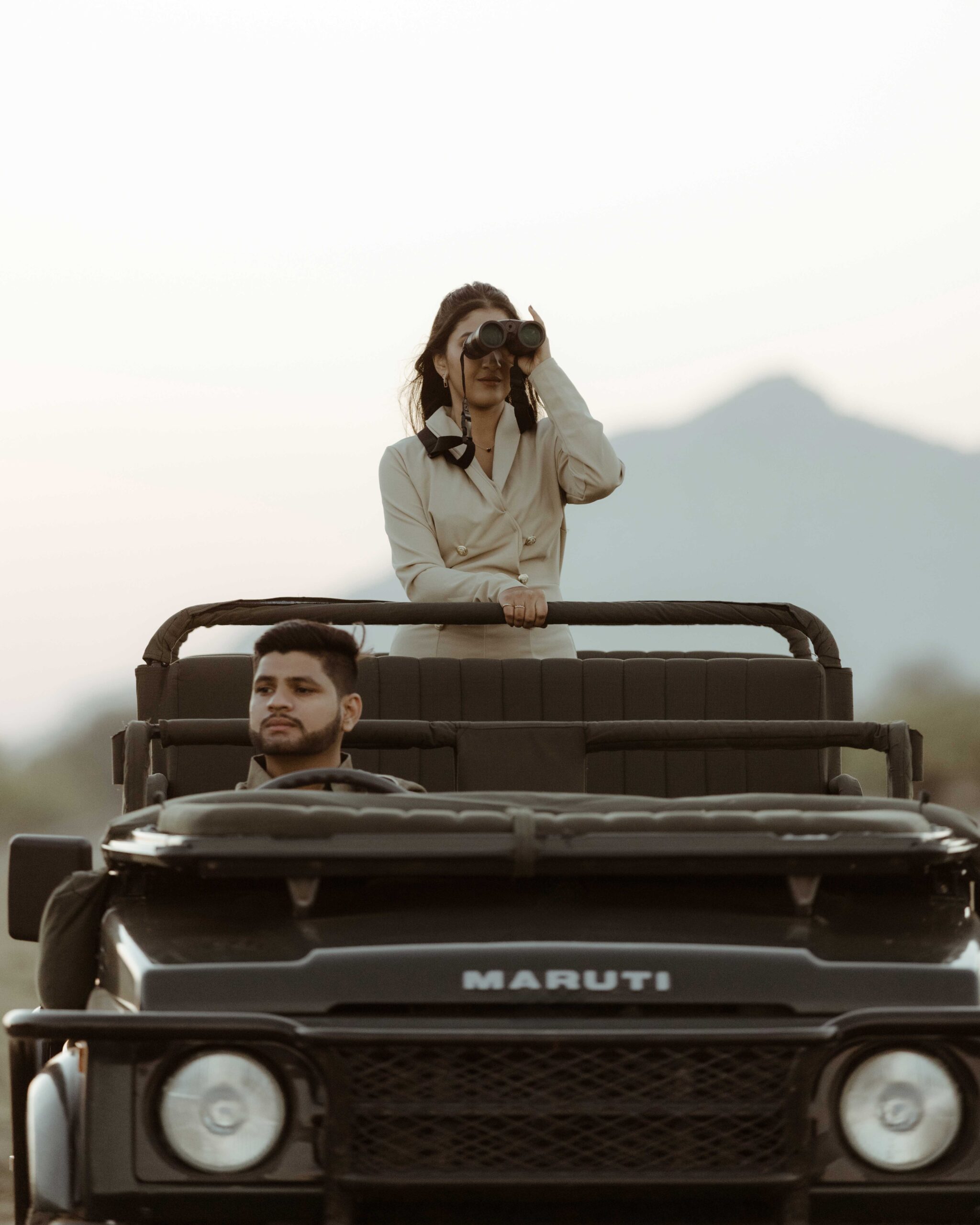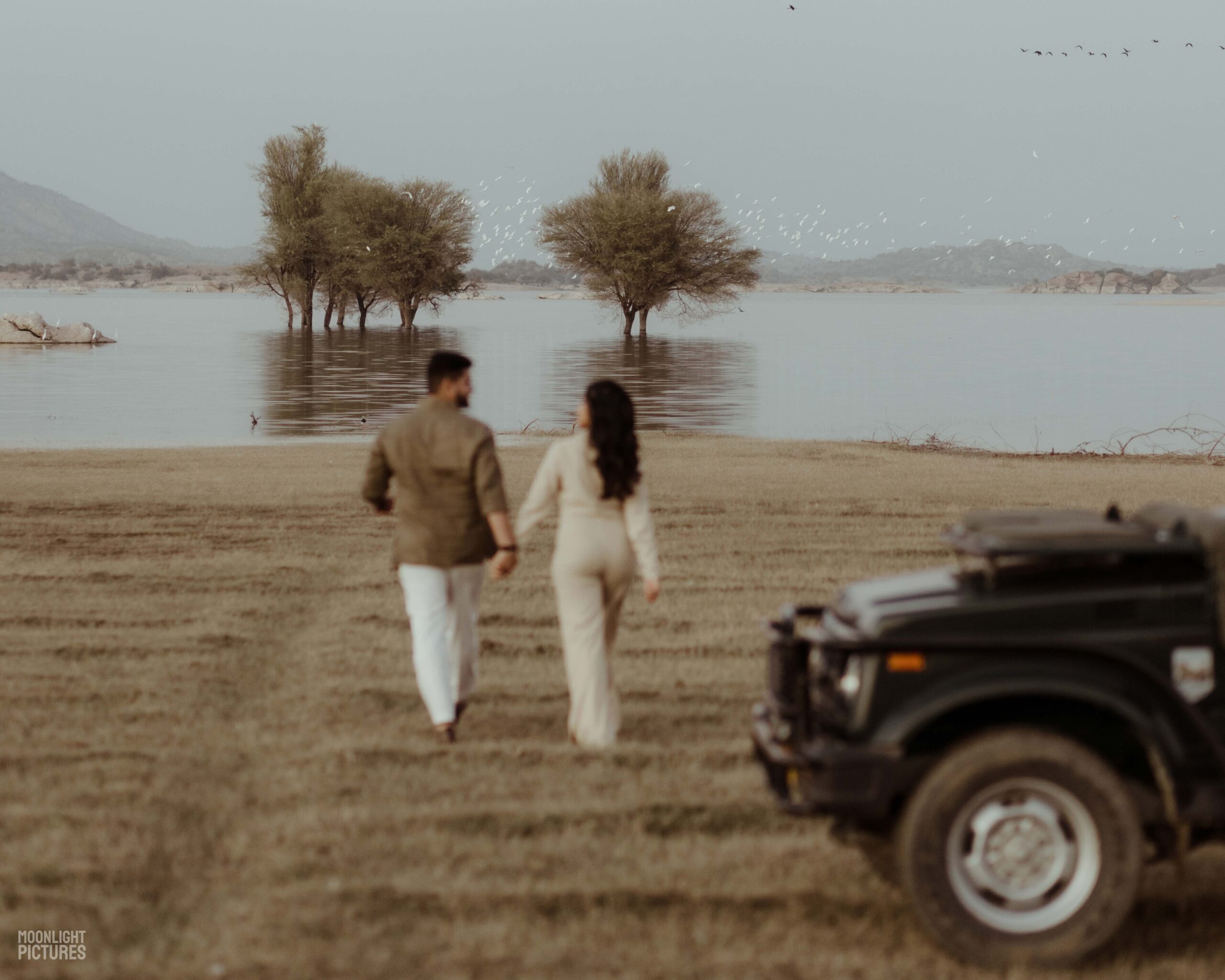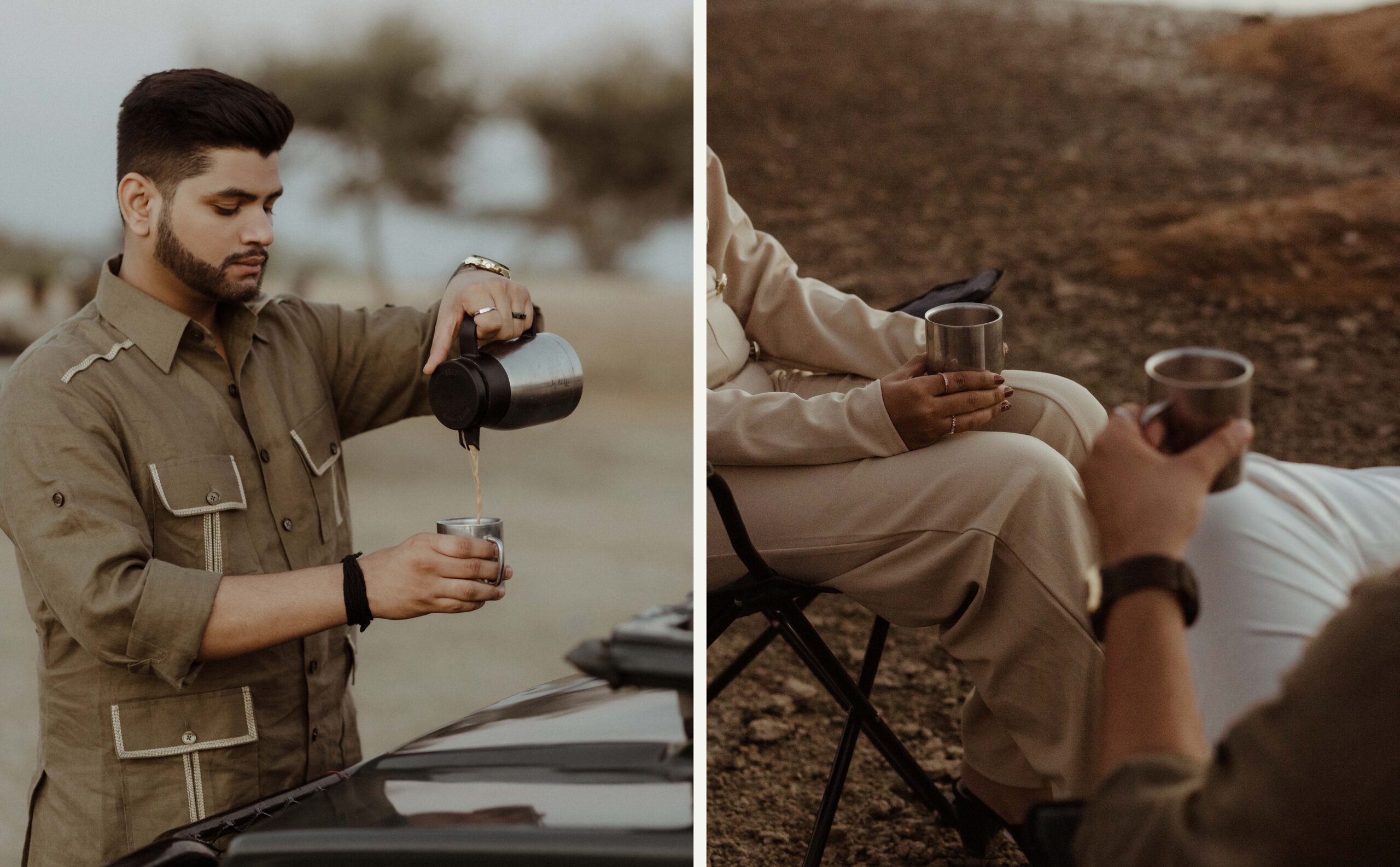 In the heart of Jawai, where the skies stretch vast and the silence speaks in rustling leaves and distant bird calls, Kalrav and Urmi found a rhythm that was deeply their own. Their story unfolded not in choreographed poses, but in quiet moments; a glance over a shoulder, a shared sip of coffee by the lake, wind-tousled hair catching the last light of the day. The pastel tones of their journey, soft cream and gentle teal, felt like an echo of who they are together: calm, grounded, yet touched with wild golden freedom. It was never about the perfect frame. It was about the feeling. The way she stood tall on the back of the gypsy as he drove, completely herself. The way he let her be, with pride in his eyes and ease in his heart. They moved through the rugged wilderness not as tourists in love, but as two souls who understood that true love does not cage, it sets free.