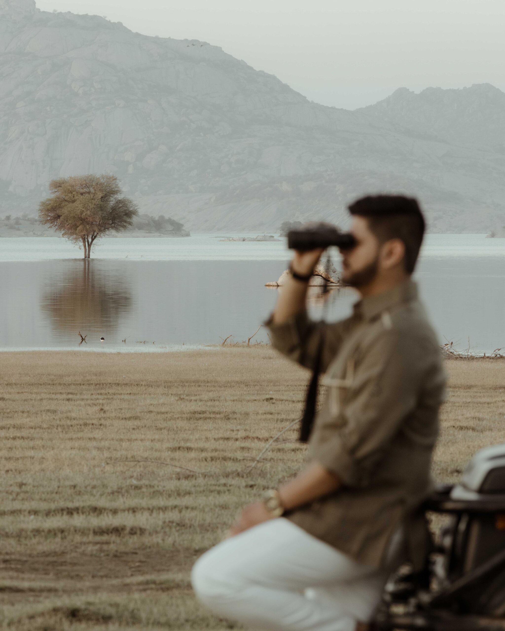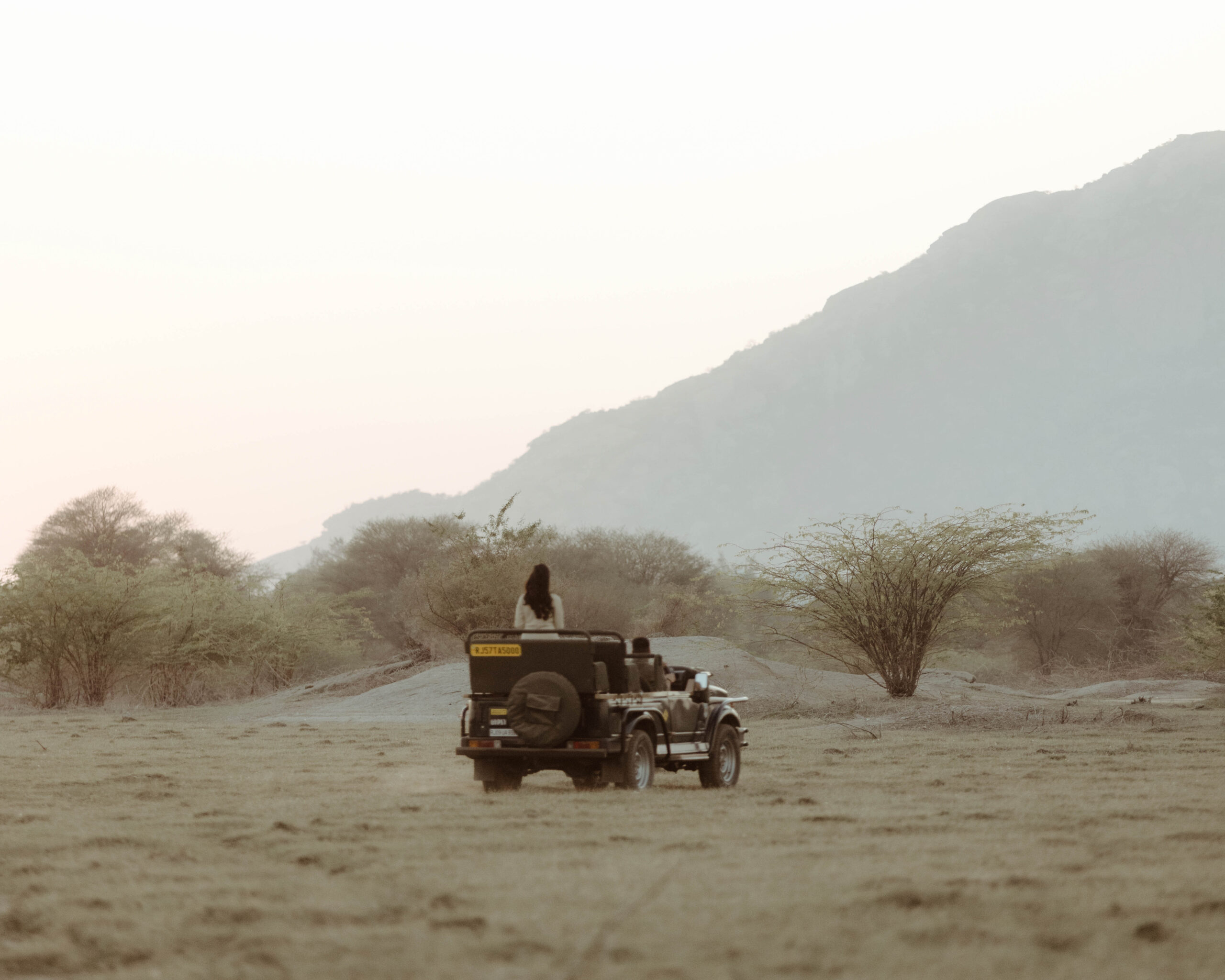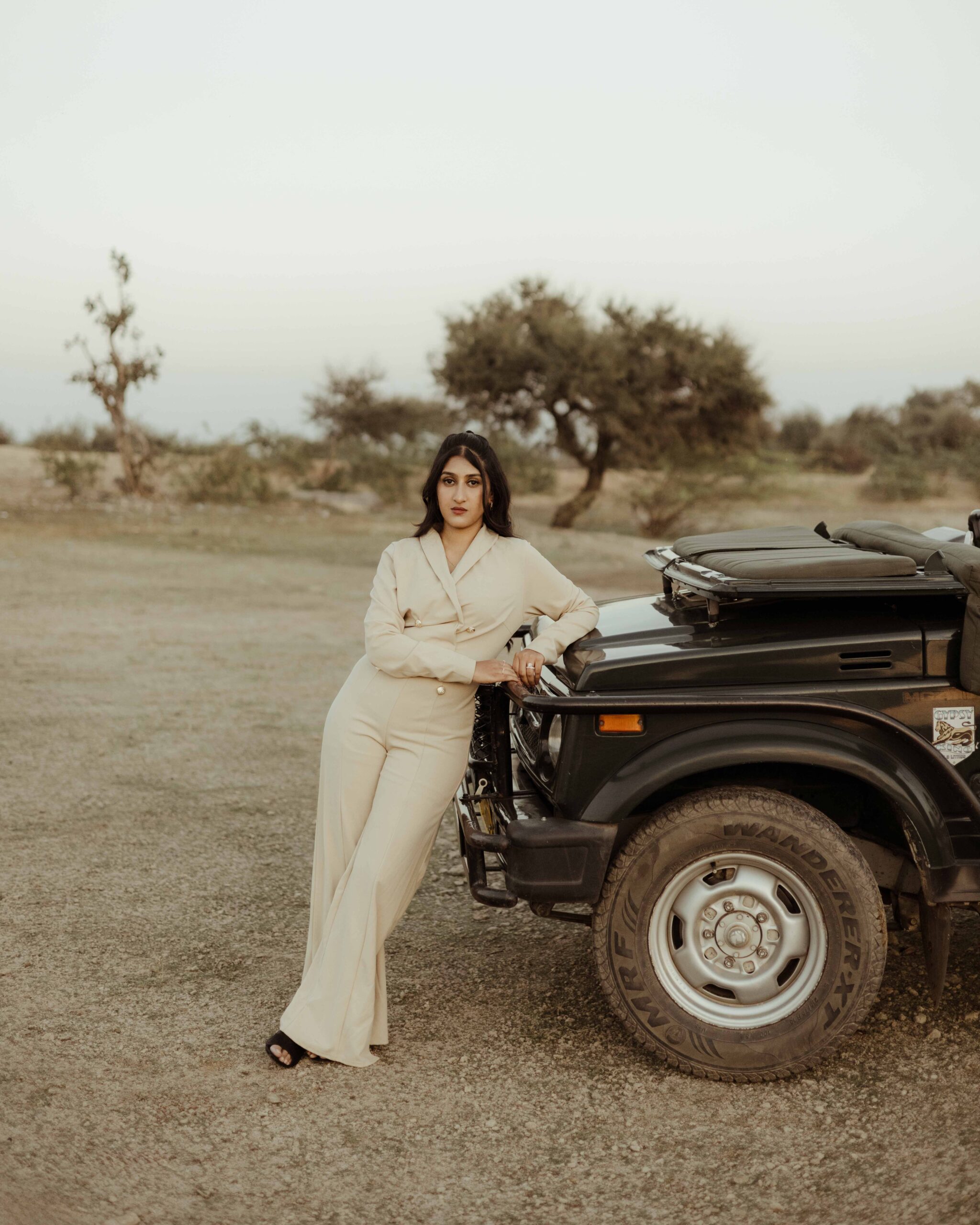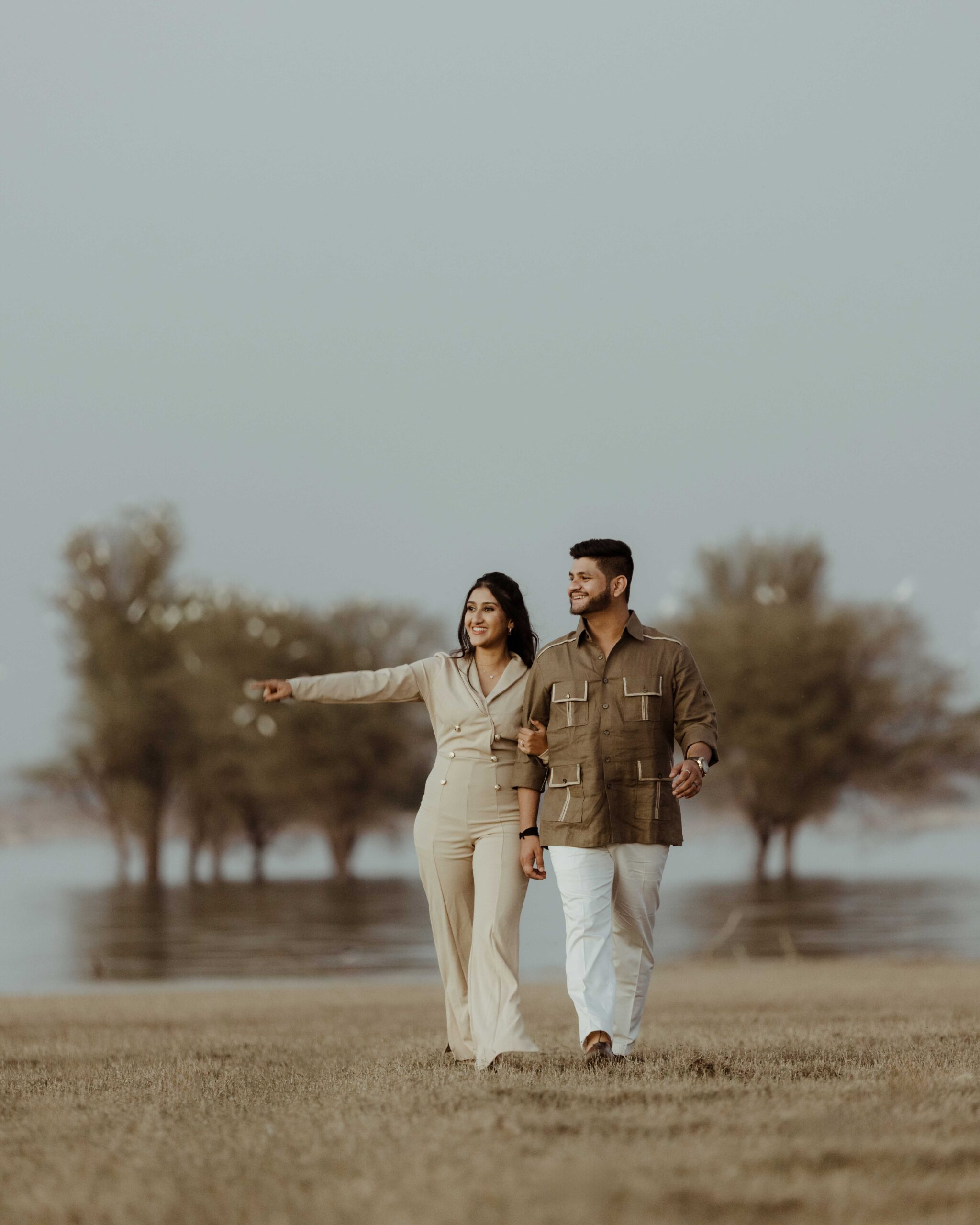 In the heart of Jawai, where the skies stretch vast and the silence speaks in rustling leaves and distant bird calls, Kalrav and Urmi found a rhythm that was deeply their own. Their story unfolded not in choreographed poses, but in quiet moments; a glance over a shoulder, a shared sip of coffee by the lake, wind-tousled hair catching the last light of the day. The pastel tones of their journey, soft cream and gentle teal, felt like an echo of who they are together: calm, grounded, yet touched with wild golden freedom. It was never about the perfect frame. It was about the feeling. The way she stood tall on the back of the gypsy as he drove, completely herself. The way he let her be, with pride in his eyes and ease in his heart. They moved through the rugged wilderness not as tourists in love, but as two souls who understood that true love does not cage, it sets free.