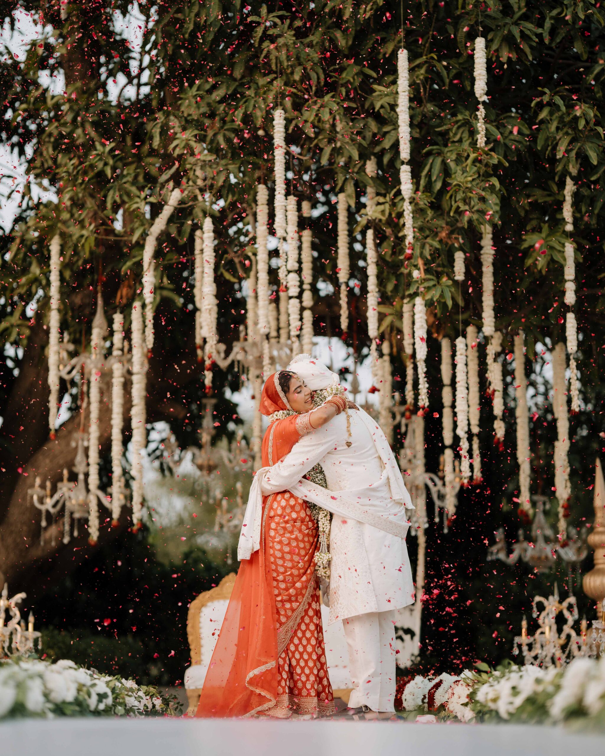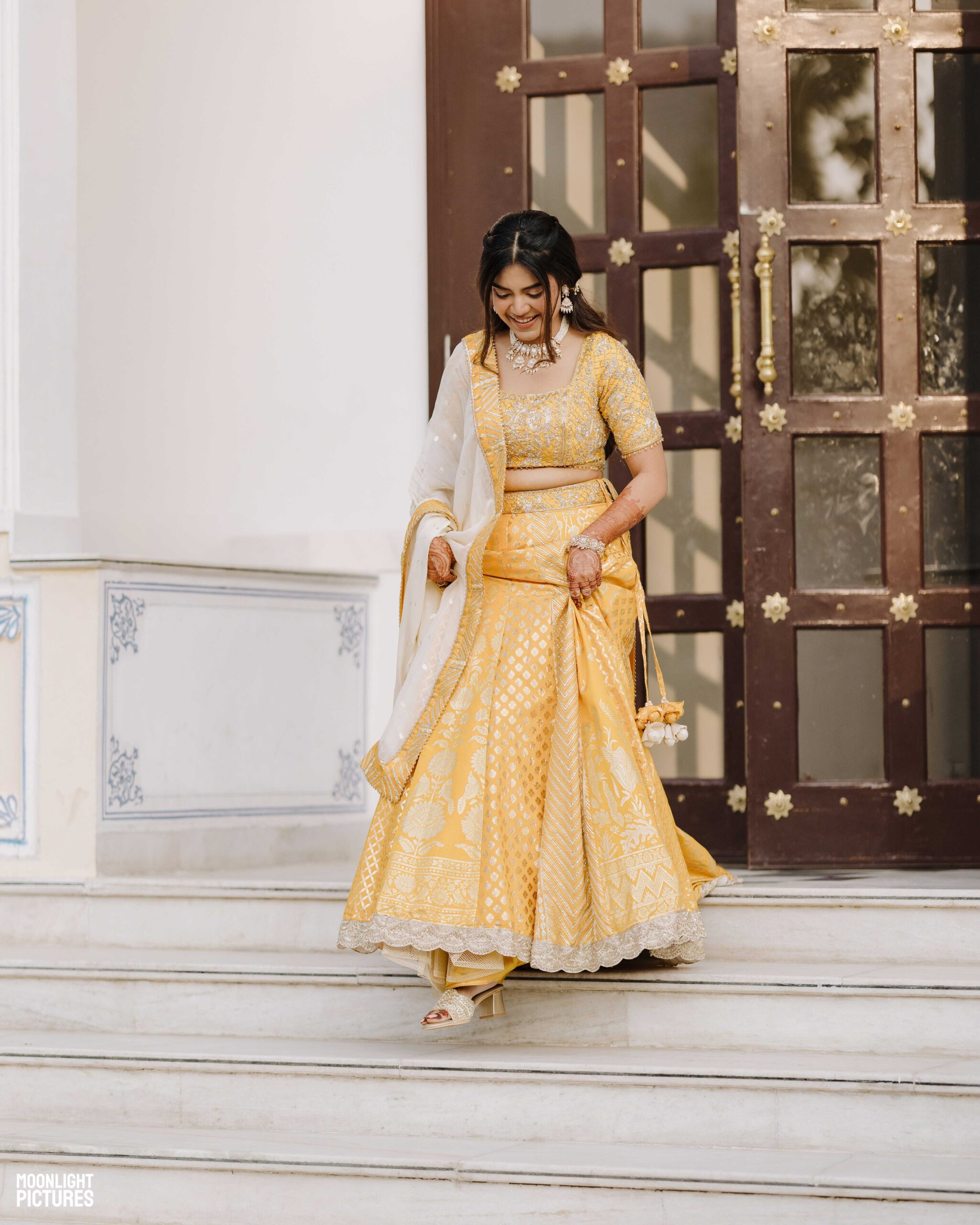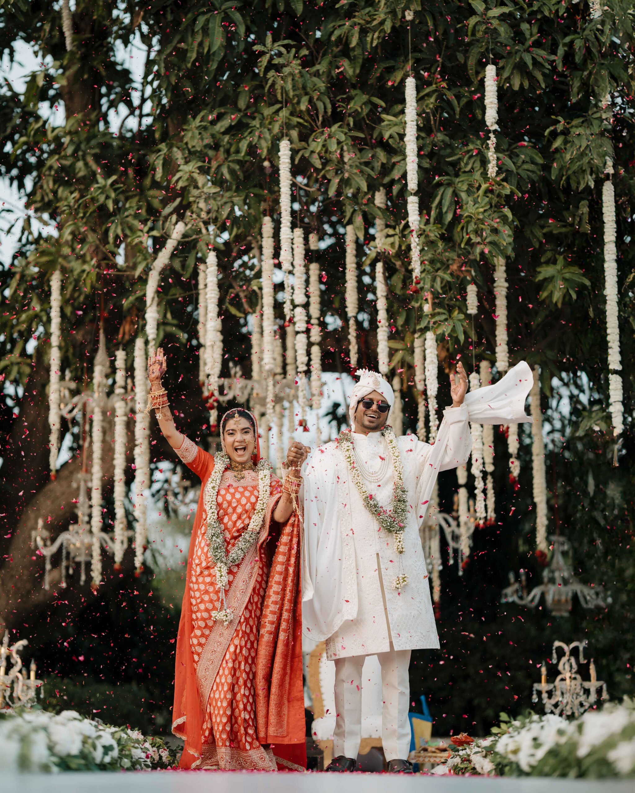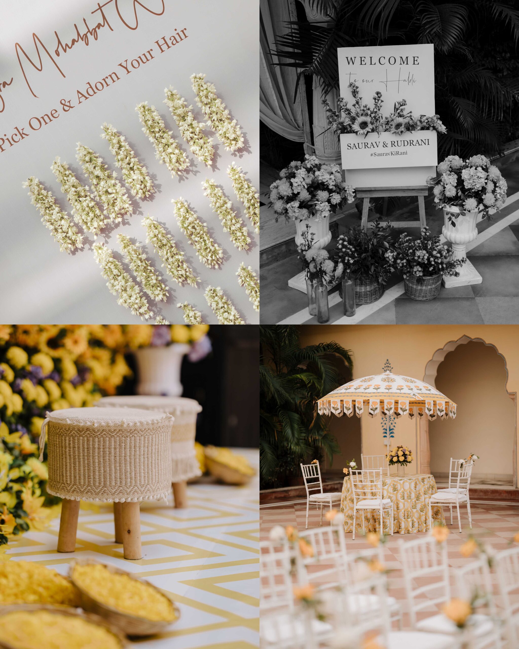 Rudrani and Sourav’s wedding was not just a celebration of rituals but a reflection of who they are as people. Soft-spoken yet expressive in all the ways that matter, their journey from being in love to becoming life partners unfolded with grace, sincerity, and an effortless charm that captured every heart. The festivities began with an intimate mehendi, where laughter filled the air as Rudrani’s hands were covered in delicate patterns symbolising moments and memories. She sat surrounded by those who love her most while Sourav stood close, occasionally stealing glances that held a lifetime of affection. Their sangeet was spirited and unfiltered, filled with the kind of joy that doesn’t need to be choreographed. It was less about perfect moves and more about celebrating a connection that felt honest. Then came the haldi ceremony, unlike any other. Instead of turmeric, yellow flower petals rained gently on them, creating a soft and magical aura that perfectly echoed their bond. They laughed, teased, and shared quiet smiles, fully present in a moment that felt less like tradition and more like a memory being etched in golden light.