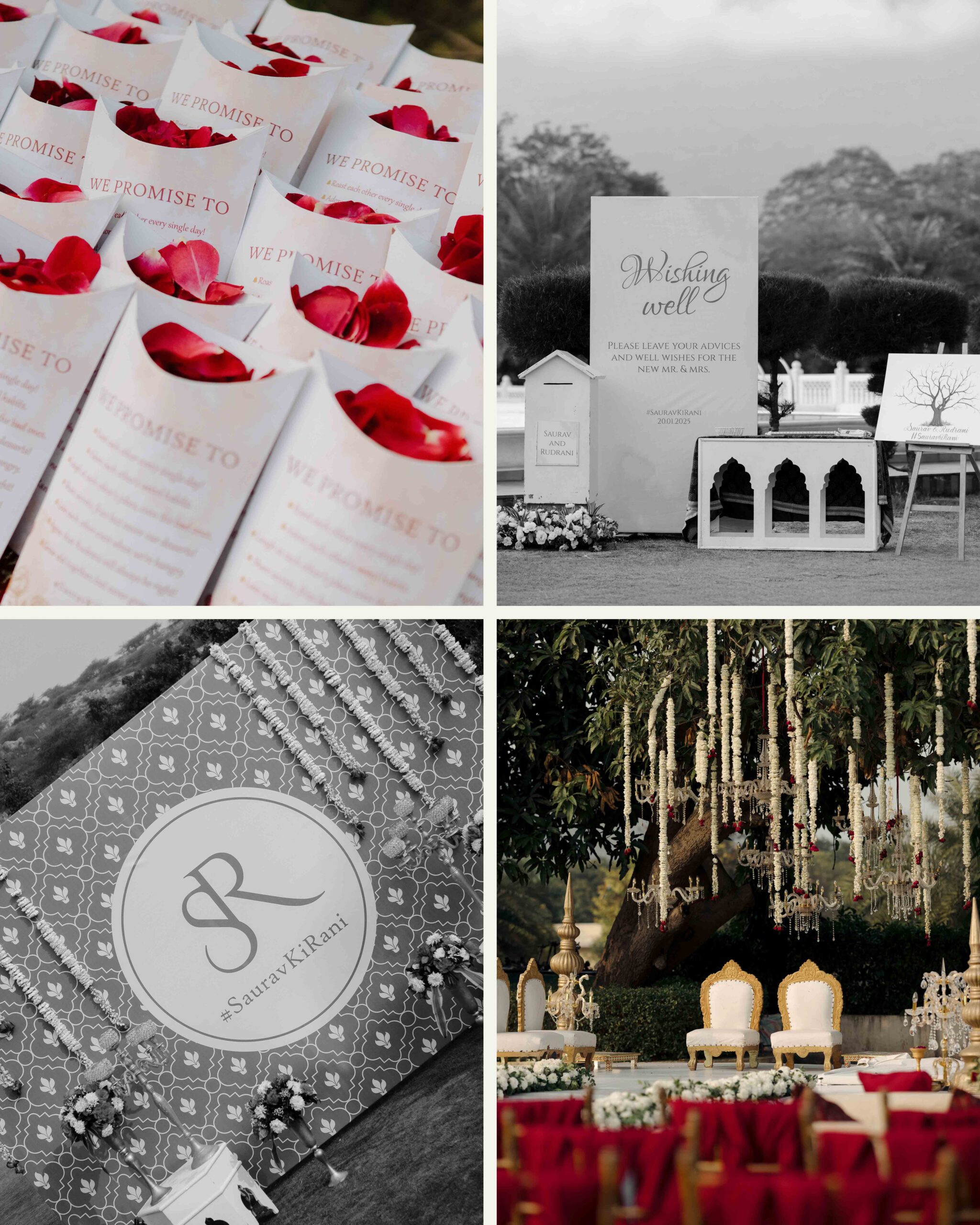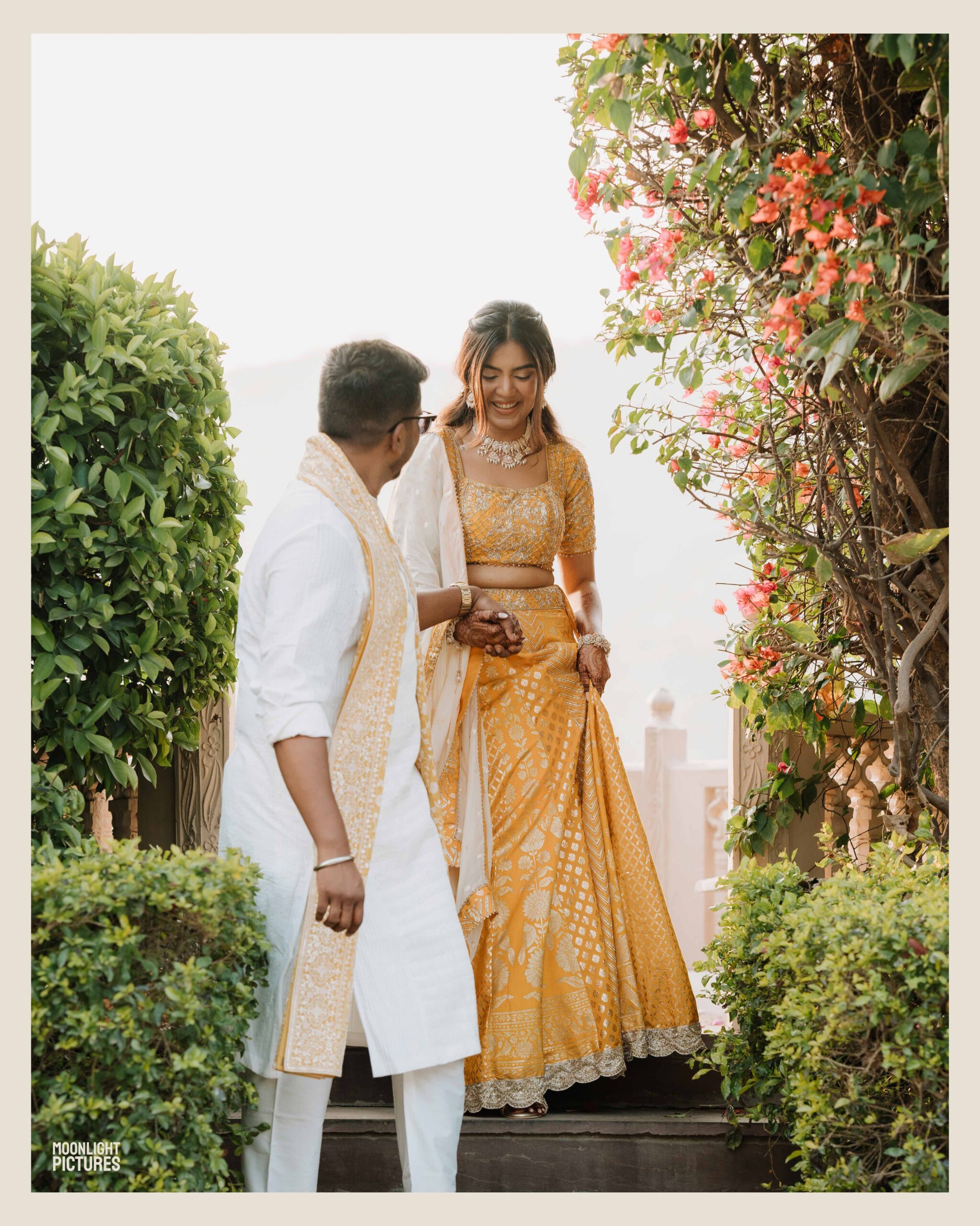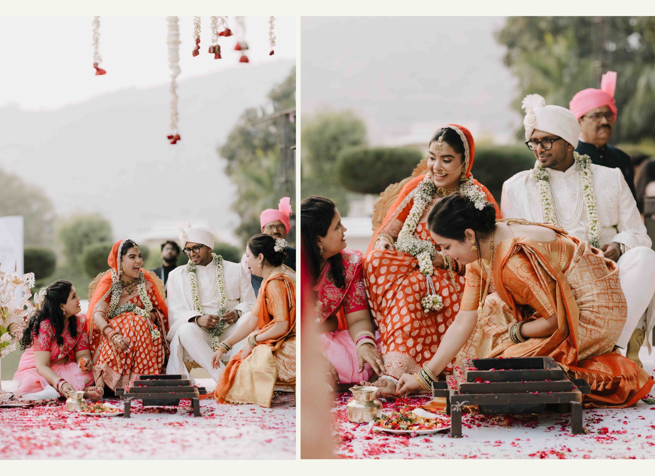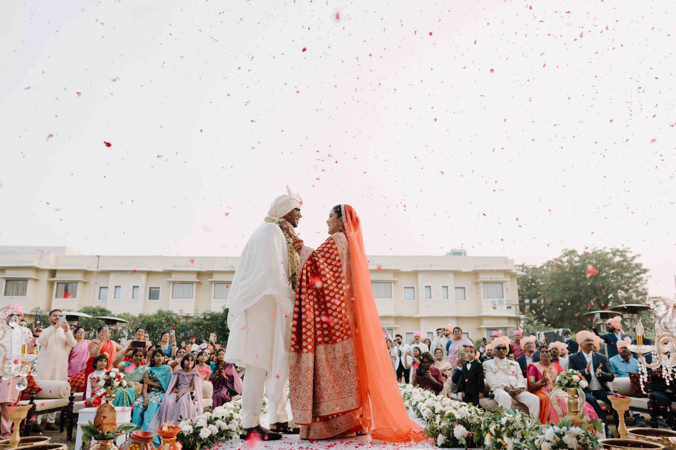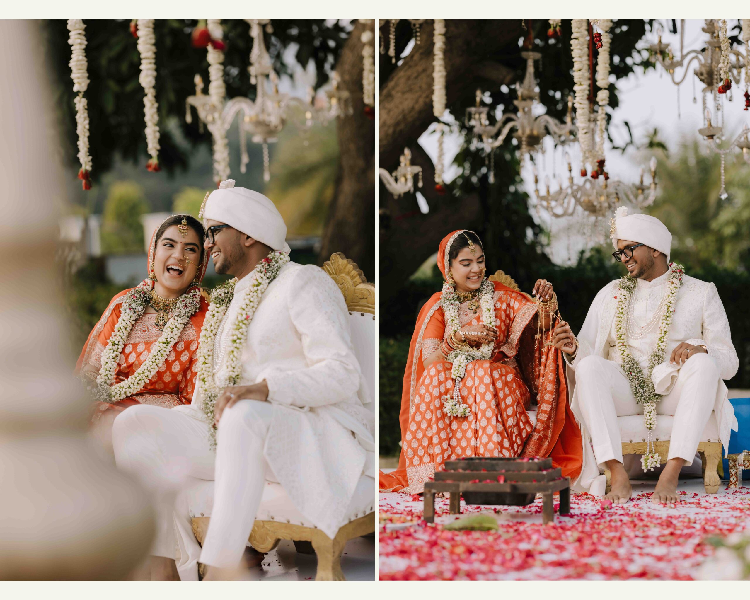 Rudrani and Sourav’s wedding was not just a celebration of rituals but a reflection of who they are as people. Soft-spoken yet expressive in all the ways that matter, their journey from being in love to becoming life partners unfolded with grace, sincerity, and an effortless charm that captured every heart. The festivities began with an intimate mehendi, where laughter filled the air as Rudrani’s hands were covered in delicate patterns symbolising moments and memories. She sat surrounded by those who love her most while Sourav stood close, occasionally stealing glances that held a lifetime of affection. Their sangeet was spirited and unfiltered, filled with the kind of joy that doesn’t need to be choreographed. It was less about perfect moves and more about celebrating a connection that felt honest. Then came the haldi ceremony, unlike any other. Instead of turmeric, yellow flower petals rained gently on them, creating a soft and magical aura that perfectly echoed their bond. They laughed, teased, and shared quiet smiles, fully present in a moment that felt less like tradition and more like a memory being etched in golden light.