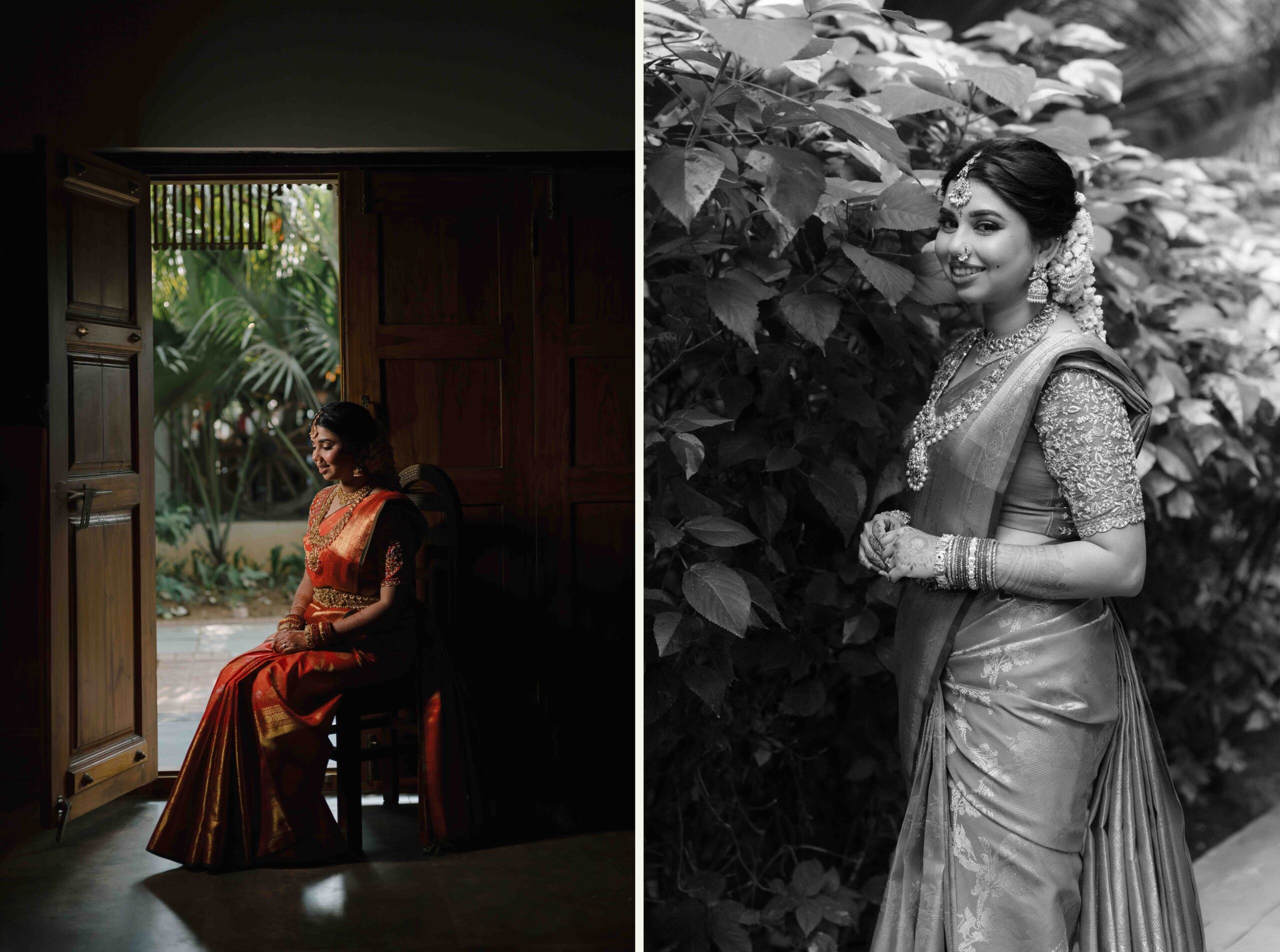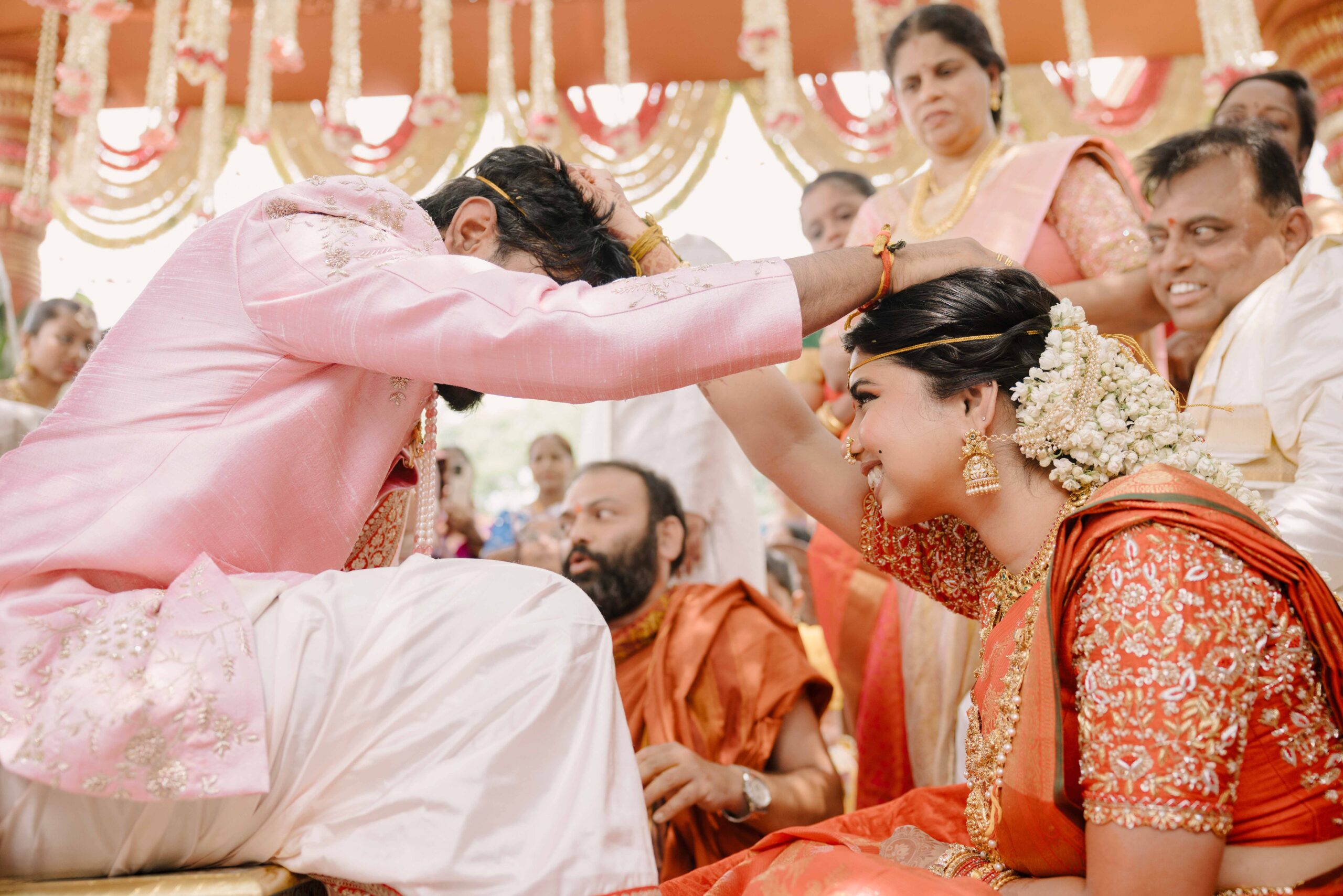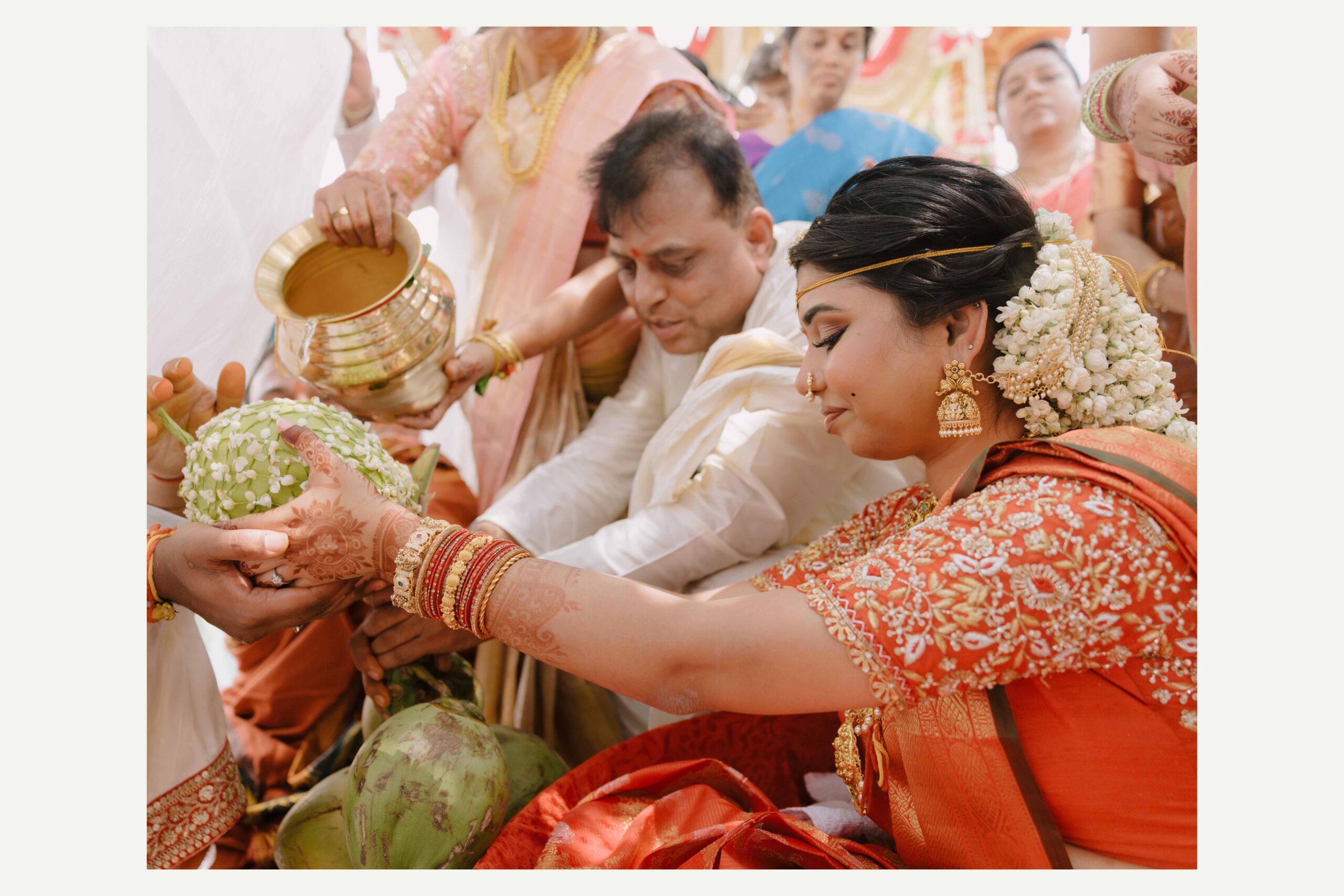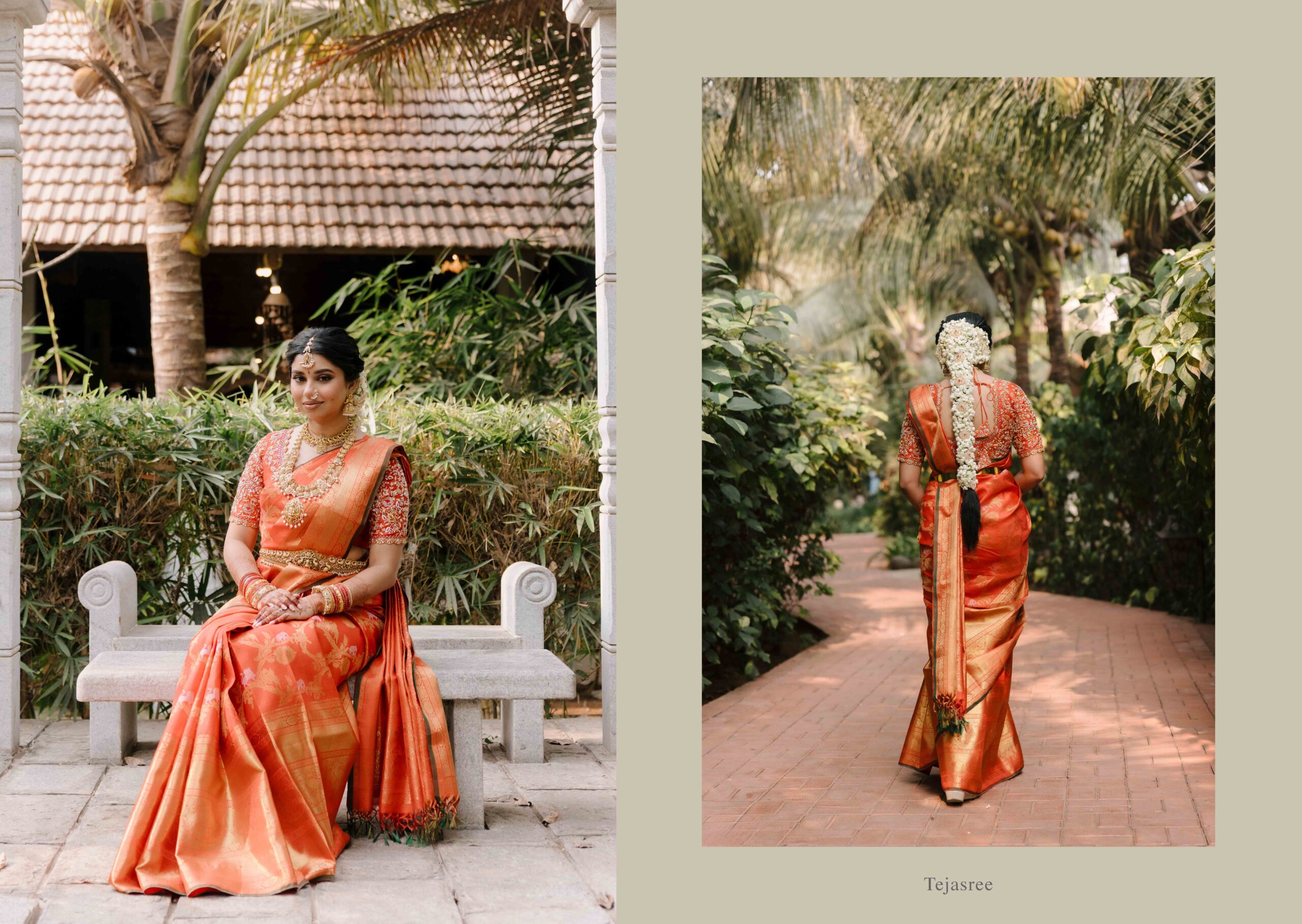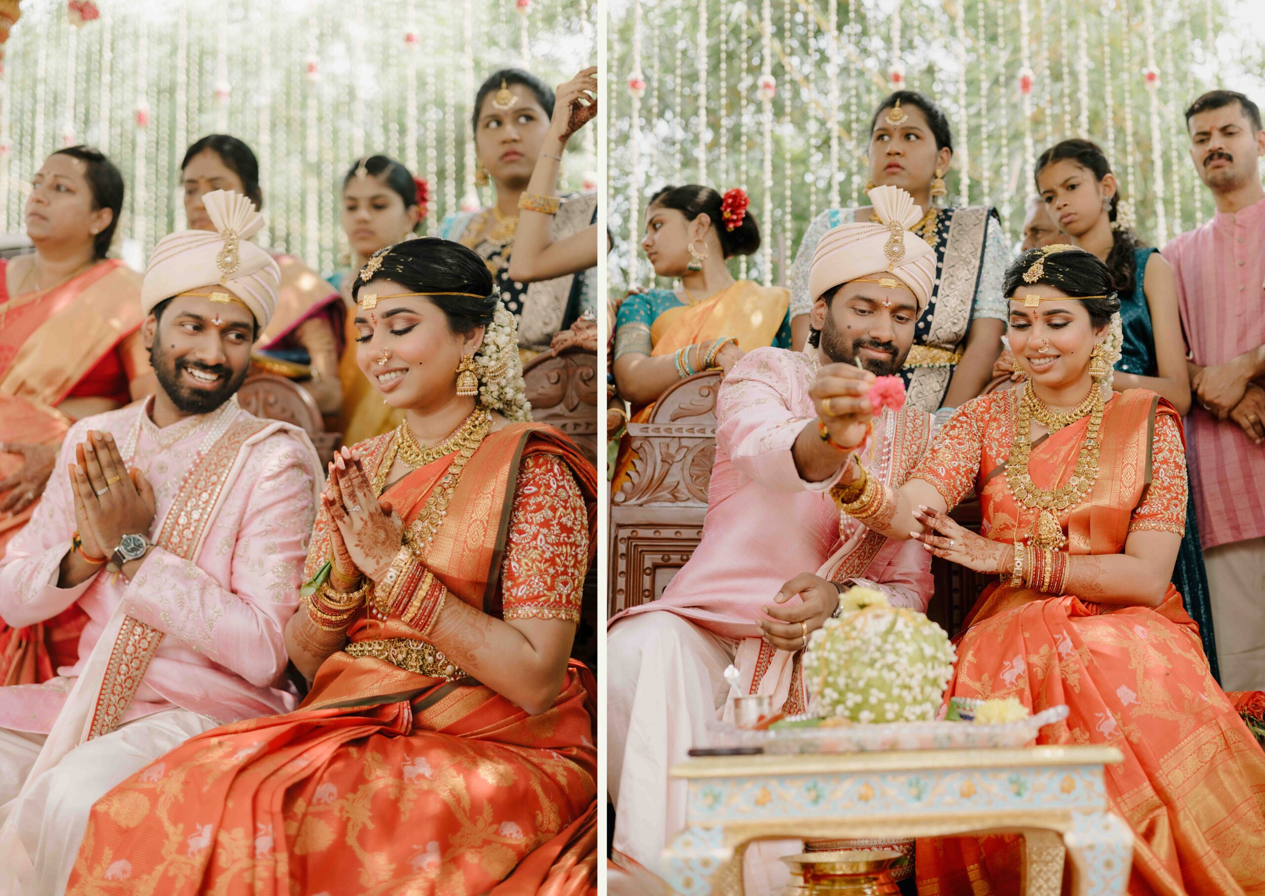 Tejasree and Rithwik are not just two people in love. They are two wild-hearted souls who found in each other a quiet refuge and an untamed adventure. Watching them get married felt like watching the universe fold in on itself with intention, placing two distinct energies side by side in a way that just made sense. Their South Indian wedding carried a warmth that went beyond rituals and ceremonies. It pulsed through the temple bells, echoed in the laughter of their closest friends, and shimmered through the earthy tones of turmeric and silk. There was nothing overdone, nothing performative. Just two imperfect species who fit together with such rare clarity that even silence between them felt like conversation. In the middle of all the color, rhythm, and prayer, they stood calm and certain, like the moment before monsoon rain touches the hills, like something sacred unfolding without effort.