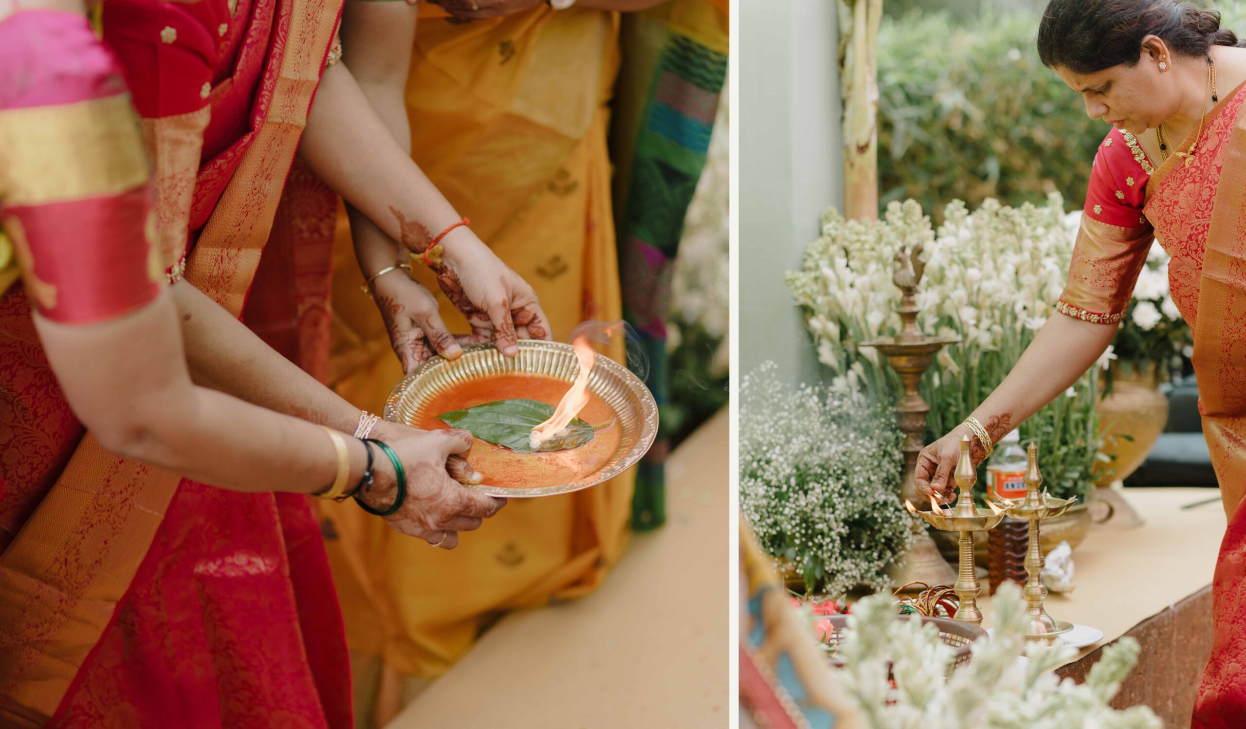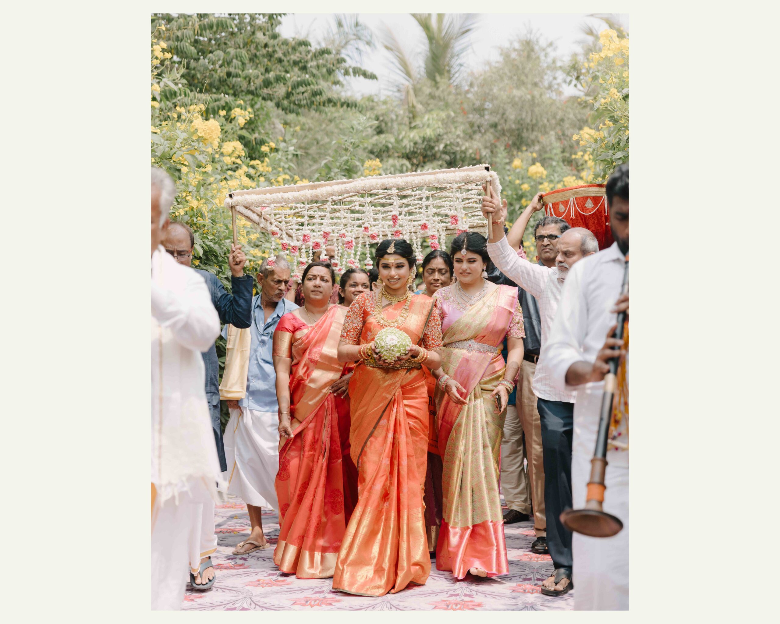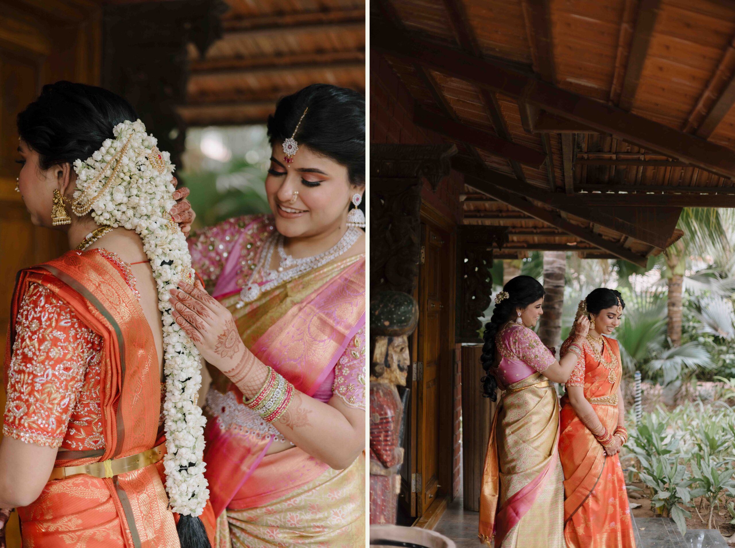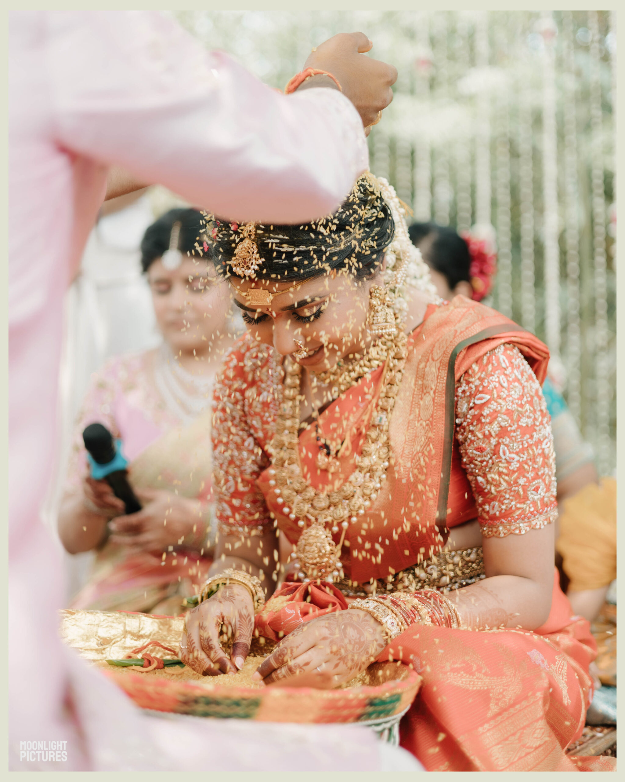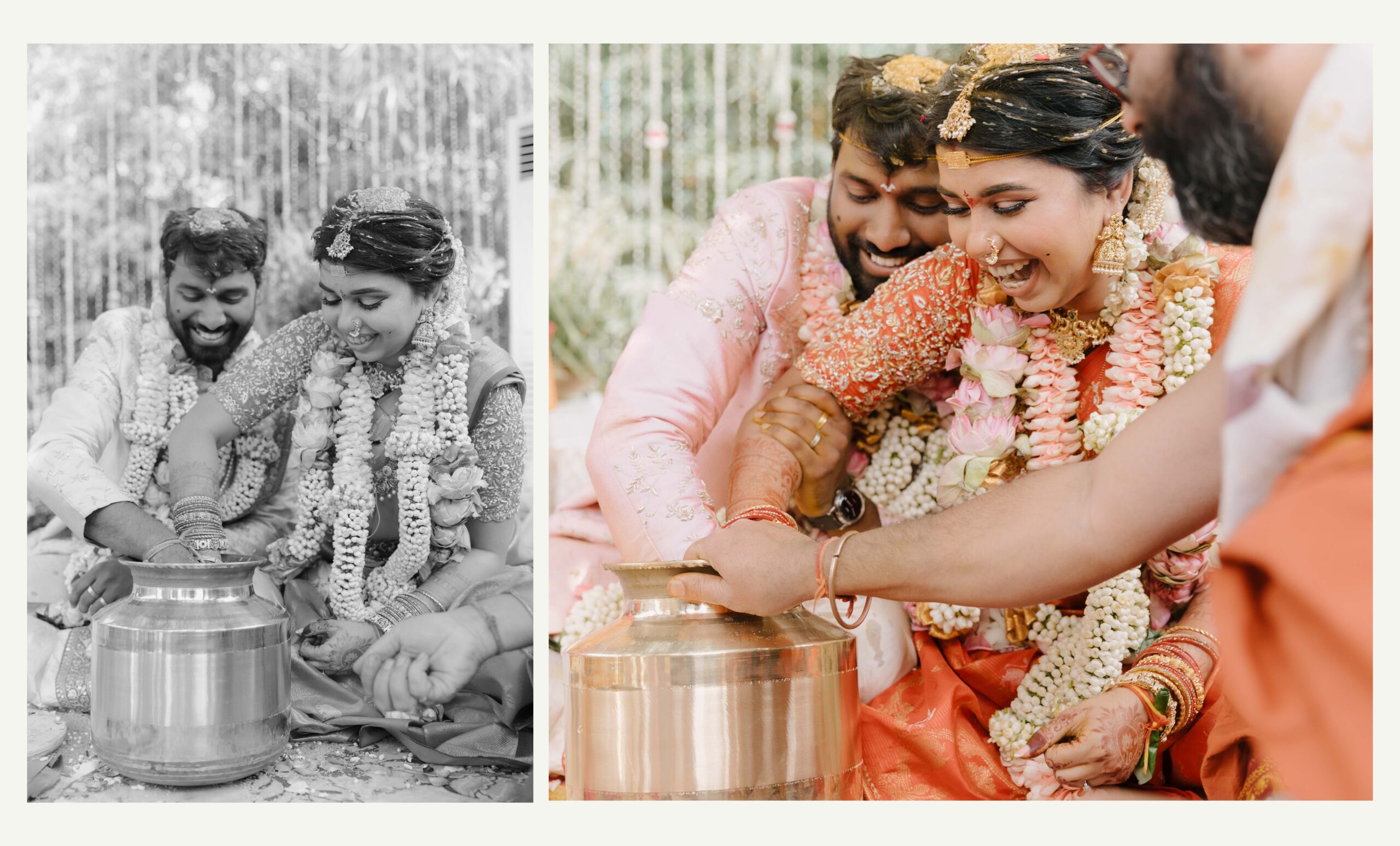 Tejasree and Rithwik are not just two people in love. They are two wild-hearted souls who found in each other a quiet refuge and an untamed adventure. Watching them get married felt like watching the universe fold in on itself with intention, placing two distinct energies side by side in a way that just made sense. Their South Indian wedding carried a warmth that went beyond rituals and ceremonies. It pulsed through the temple bells, echoed in the laughter of their closest friends, and shimmered through the earthy tones of turmeric and silk. There was nothing overdone, nothing performative. Just two imperfect species who fit together with such rare clarity that even silence between them felt like conversation. In the middle of all the color, rhythm, and prayer, they stood calm and certain, like the moment before monsoon rain touches the hills, like something sacred unfolding without effort.